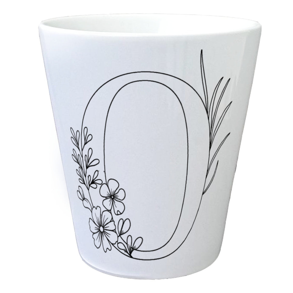 - Dieser Blumentopf zeigt ein elegantes Design mit einem großen Buchstaben O, das in einer aquarellartigen Textur gestaltet ist. Zarte Blumen, Blätter und Gras umrahmen den Buchstaben. Der weiße Hintergrund lenkt den Fokus auf diese künstlerische Schönheit.