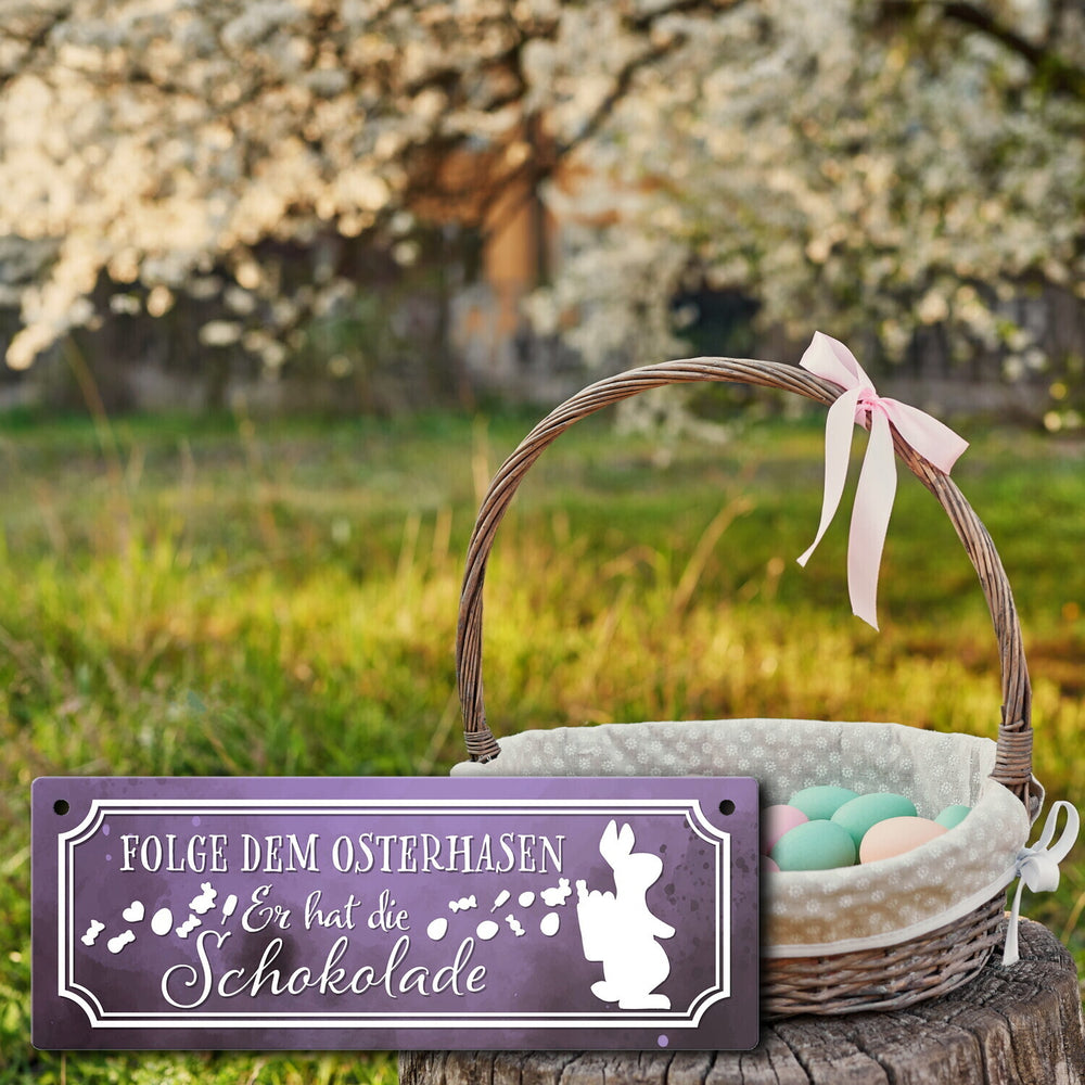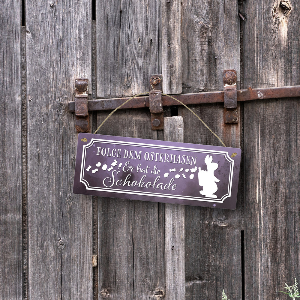 - 1x Folge dem Osterhasen, er hat die Schokolade Metallschild in der gewählten Größe