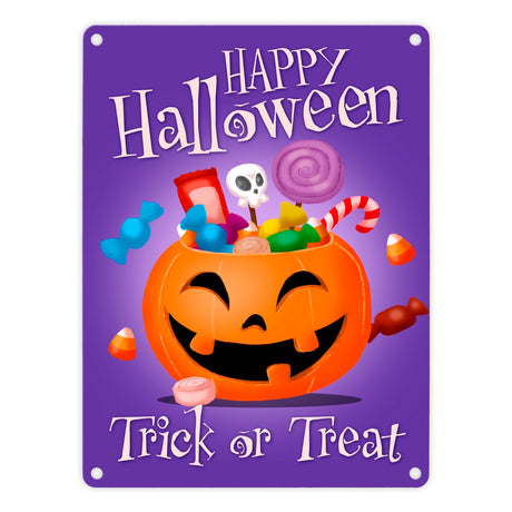 Happy Halloween Trick or Treat Metallschild in lila mit süßem Kürbis