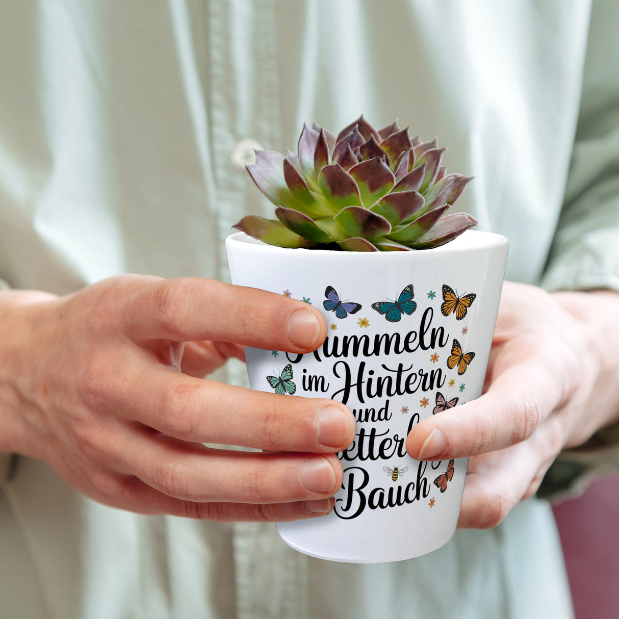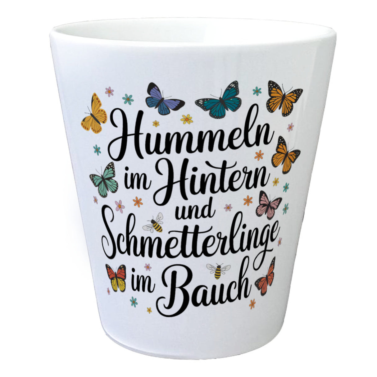 - Stellt euch einen weißen Blumentopf vor, der mit einem zauberhaften Motiv aus bunten Schmetterlingen und fröhlichen Hummeln geschmückt ist! Der witzige Spruch "Hummeln im Hintern und Schmetterlinge im Bauch" rundet das frühlingshafte Design ab. Kleine Blumen setzen bunte Akzente, die das Herz jedes Naturfreunds höherschlagen lassen.