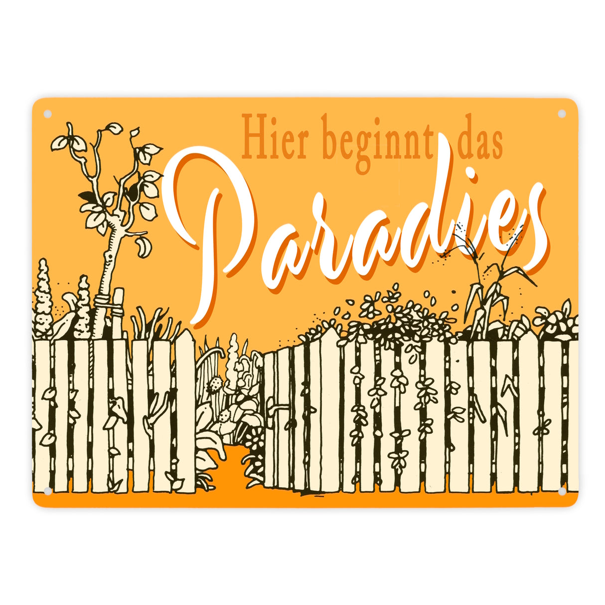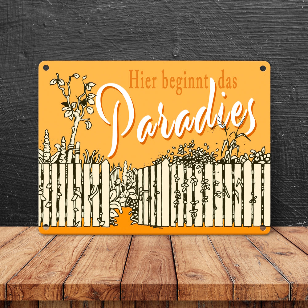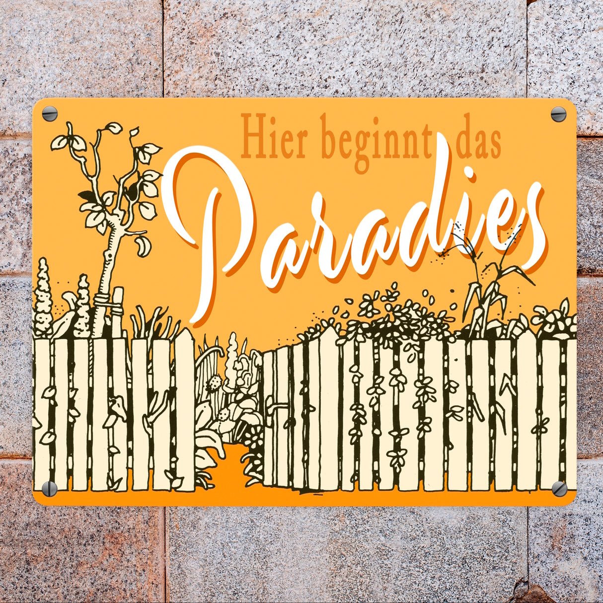 - 1x Gartenparadies Metallschild orange zum Thema Urlaub im Garten in der gewählten Größe