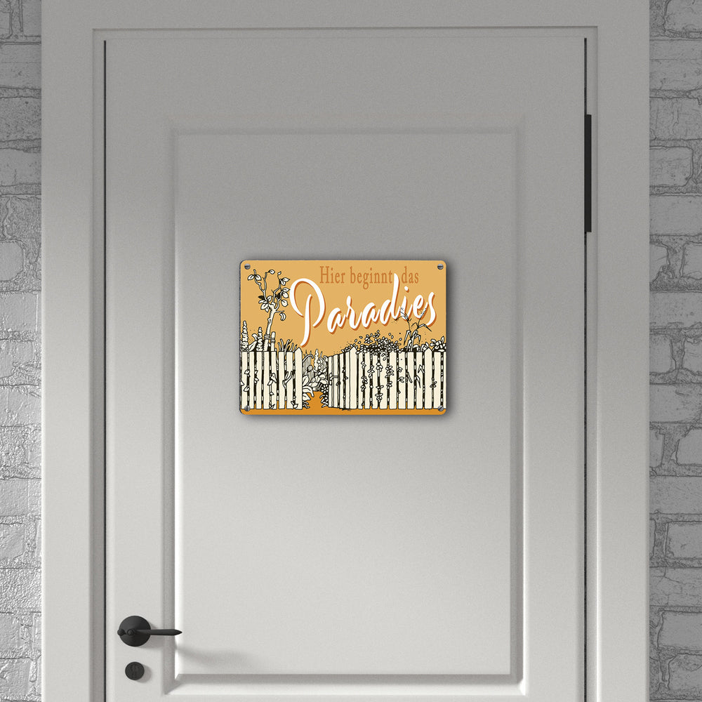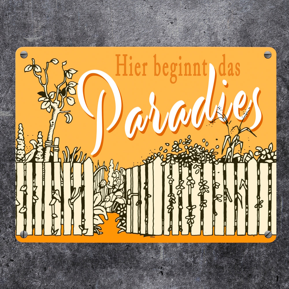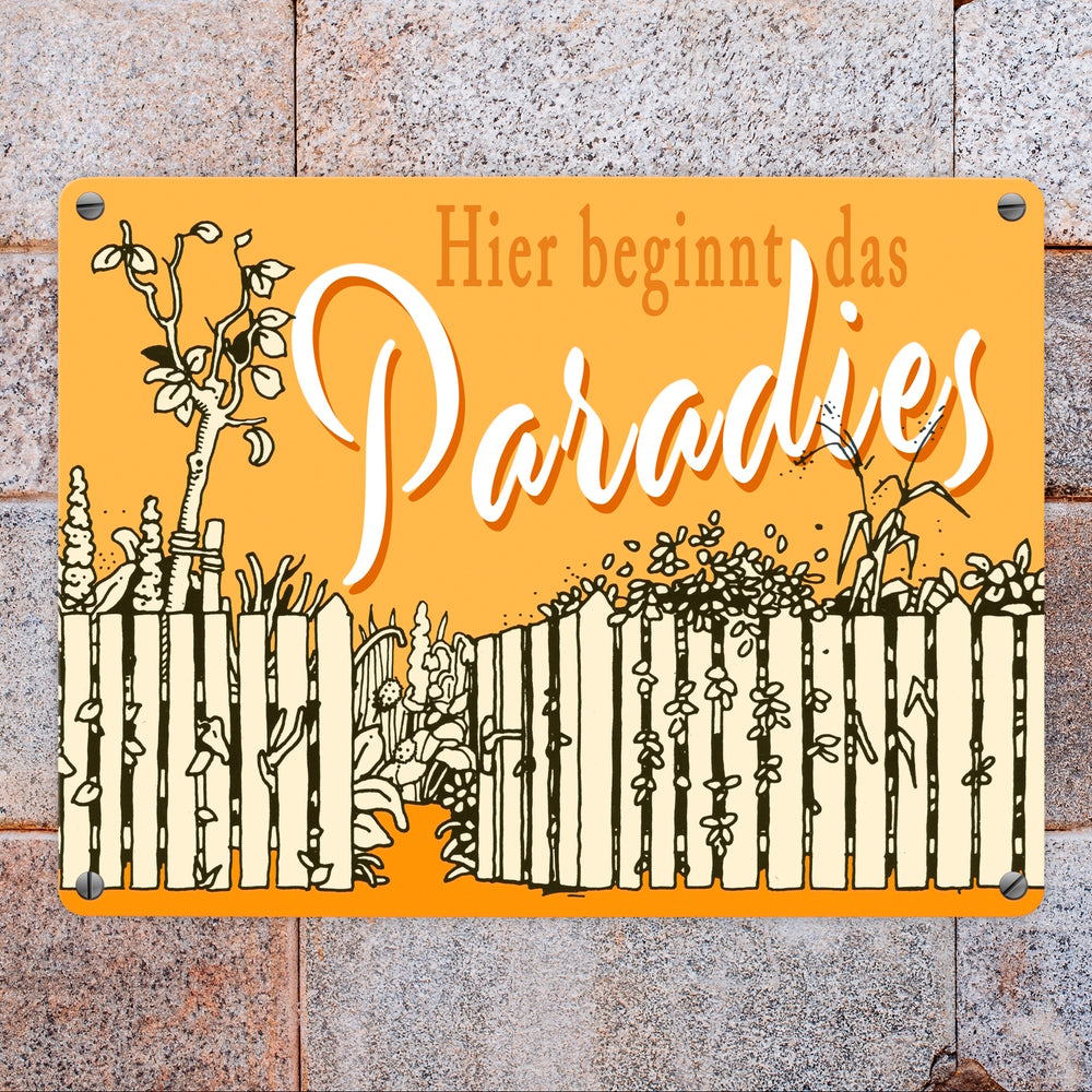 Gartenparadies Metallschild orange zum Thema Urlaub im Garten