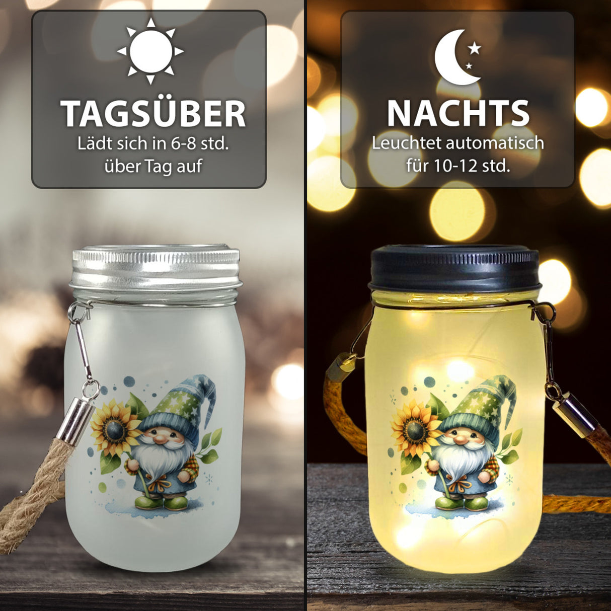 - Im Deckel verarbeitete Lichterkette mit 40 LEDs. Outdoor geeignet. Läd sich im Sonnenlicht auf und leuchtet in der Dunkelheit bis zu 12h. Mit dekorativem Seil zum Aufhängen. Benötigt 1x AAA-Akku (nicht im Lieferumfang)