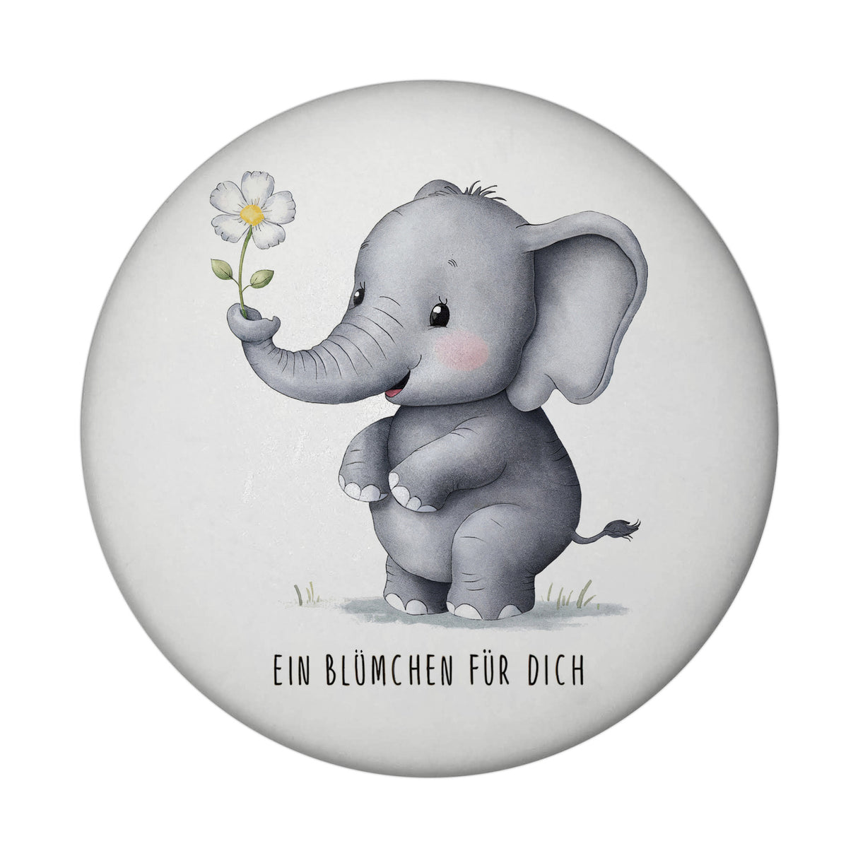 - Dieser runde Magnet zeigt einen entzückenden grauen Elefanten, der charmant eine weiße Blume mit gelbem Zentrum in seinem Rüssel hält. Der Hintergrund ist schlicht in Weiß gehalten, wodurch das Motiv besonders hervorsticht. Am unteren Rand steht fröhlich der Spruch 'ein Blümchen für dich'. Ein zauberhaftes Design voller Herzlichkeit und Humor!