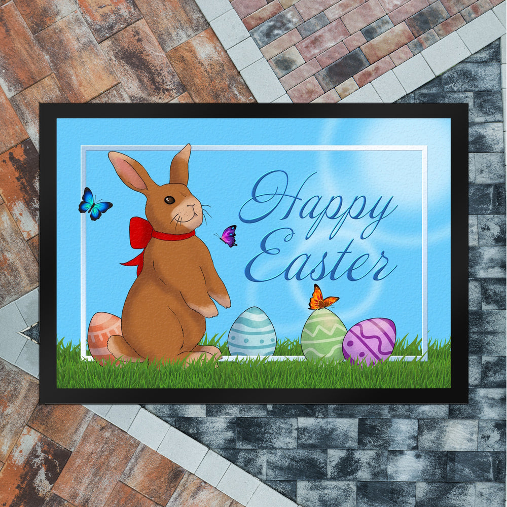 - 1x Happy Easter Fußmatte mit Osterhasen und bunten Ostereiern in der gewählten Größe