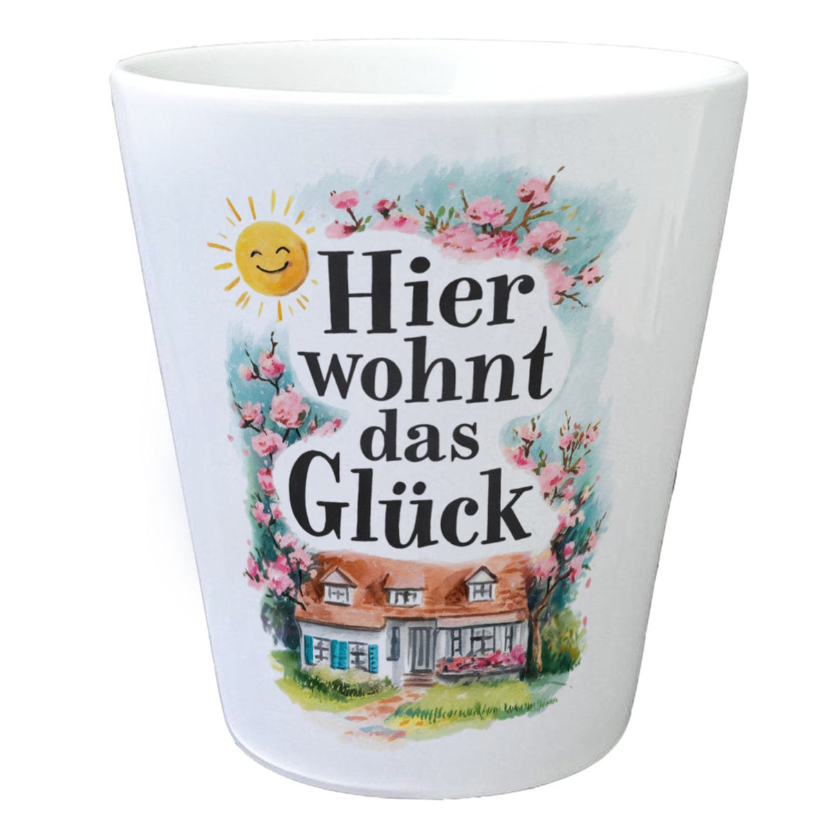 - Dieser Blumentopf ist ein Kunstwerk voller Freude! Auf weißem Hintergrund präsentiert er ein Aquarell-Design in Pastellfarben. Mit dem Spruch "Hier wohnt das Glück" illustriert von einem idyllischen Haus, blühenden Bäumen und einer lachenden Sonne versprüht er Fröhlichkeit und gute Laune. Ein echtes Highlight für Ihr Zuhause!