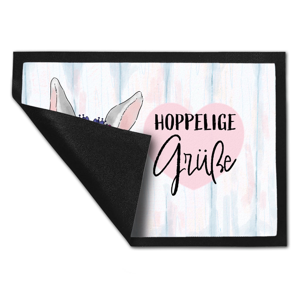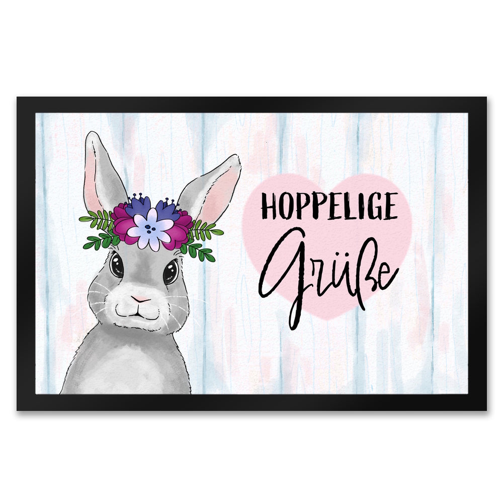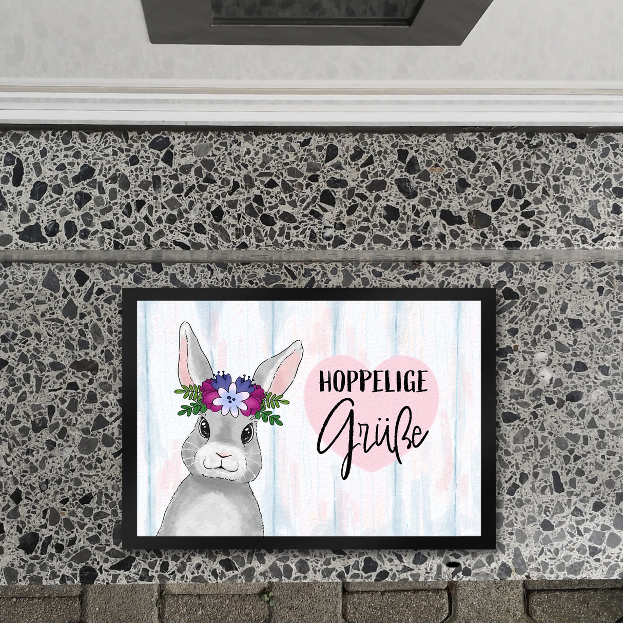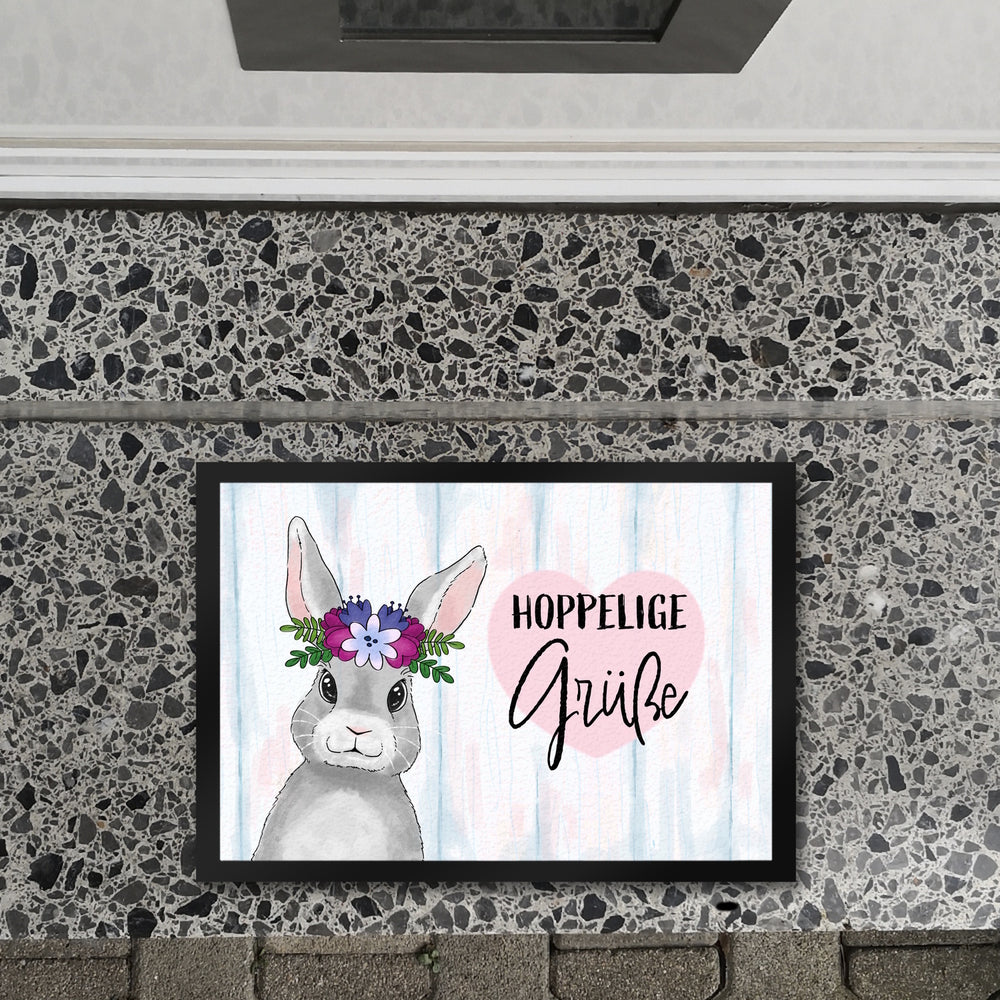 Hoppelige Grüße Fußmatte mit süßem Osterhase und Blumen