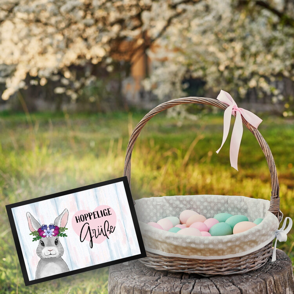 • 1x Hoppelige Grüße Fußmatte mit süßem Osterhase und Blumen in der gewählten Größe