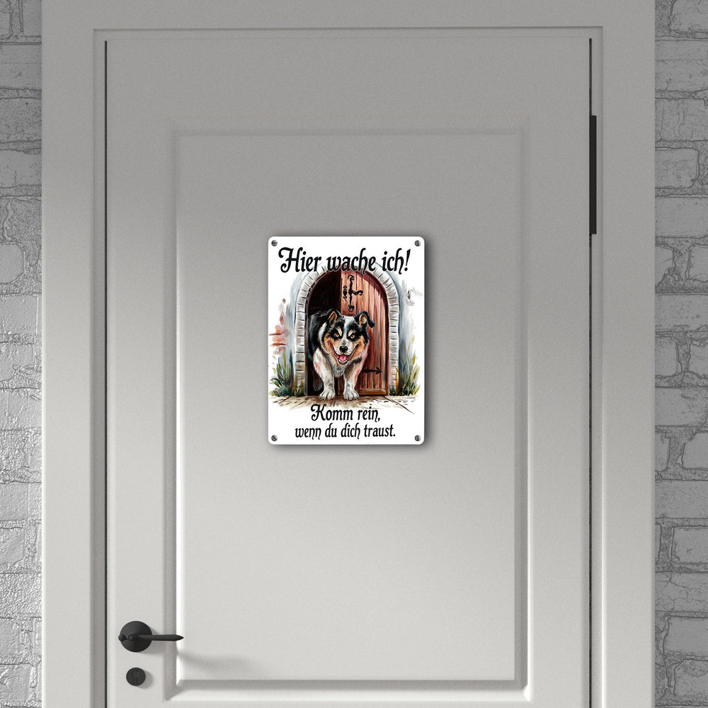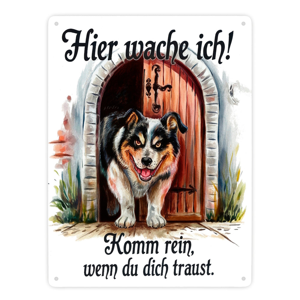 - Dieses Metallschild beeindruckt mit seinem charmanten Design: ein freudiger Border Collie schaut mutig aus einer Holztür. Auf einem weißen Hintergrund prangen in Pastellfarben die deutschen Worte "Hier wache ich! Komm rein, wenn du dich traust.", während der Hund schelmisch grinst. Perfekt für jeden Hundeliebhaber!