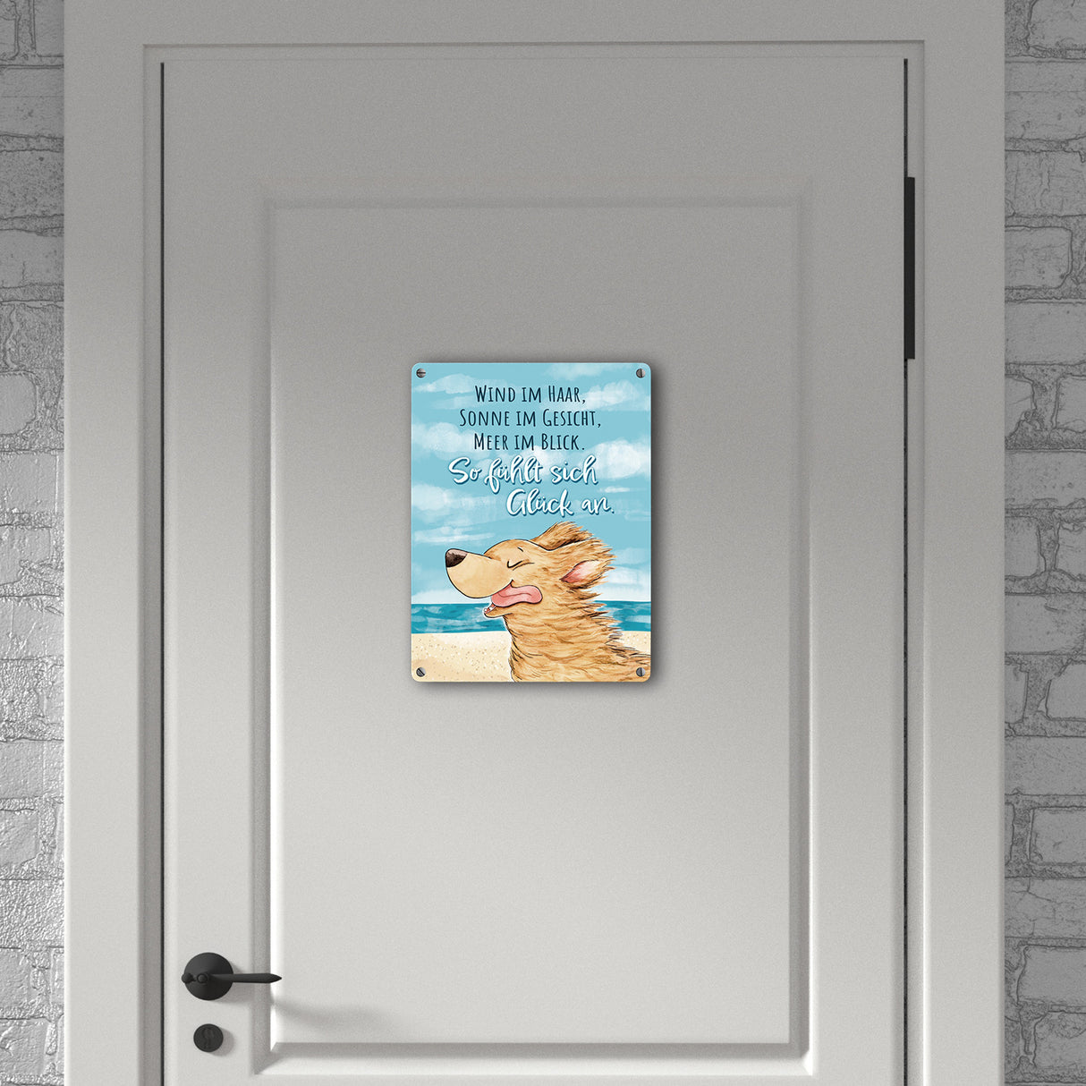 - Stellt euch vor, ihr öffnet die Tür und was grüßt euch da? Ein frecher Vierbeiner auf unserem Hund Metallschild, der sichtlich die Strand-Brise schnuppert. Mit dem Spruch "Wind im Haar, Sonne im Gesicht, Meer im Blick. So fühlt sich Glück an." beginnt jeder Tag wie ein Urlaub am Meer!