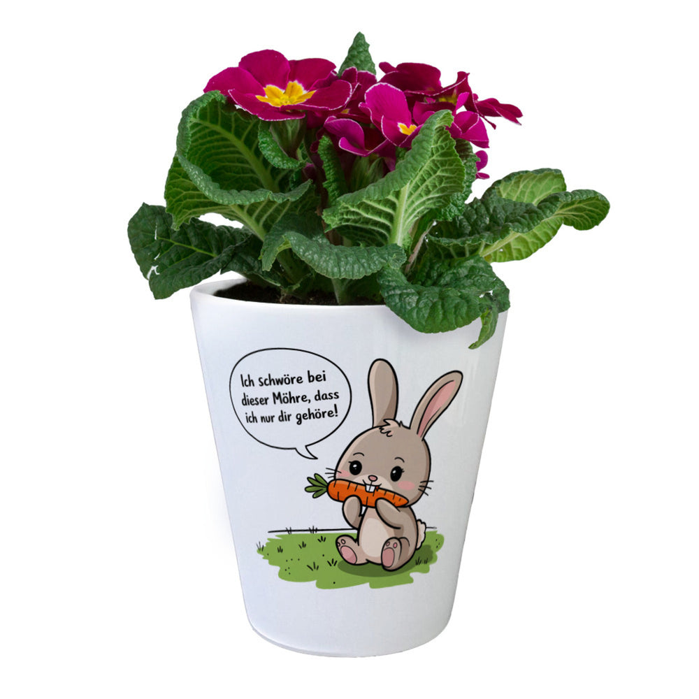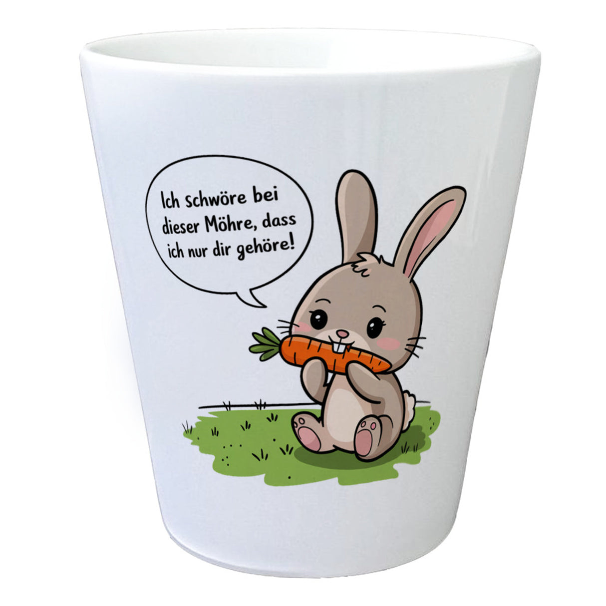 - Dieser niedliche Blumentopf zeigt einen kleinen kawaii-Hasen, der genüsslich an einer Karotte knabbert. Umgeben von einer grünen Wiese, verspricht er mit dem Spruch "Ich schwöre bei dieser Möhre, dass ich nur dir gehöre!" Eine charmante Optik in schlichten Weißtönen bringt das Motiv besonders zur Geltung.