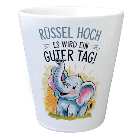 Fröhlicher Cartoon Elefant Rüssel hoch Blumentopf