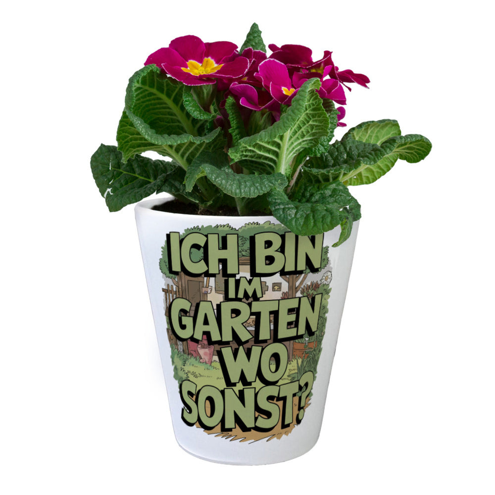 Der Blumentopf ist ein lustiges und farbenfrohes Highlight für jeden Garten! Er zeigt eine gemütliche Gartenszene im Comic-Stil mit prägnanten Worten in Großbuchstaben: "ICH BIN IM GARTEN – WO SONST?". Umrahmt von Grünpflanzen, einem charmanten Pa Hinweise: Material: Keramik / Höhe: ca. 10 cm, Durchmesser oben: ca. 9cm / Mit Bodenloch zur Vermeidung von Staunässe.