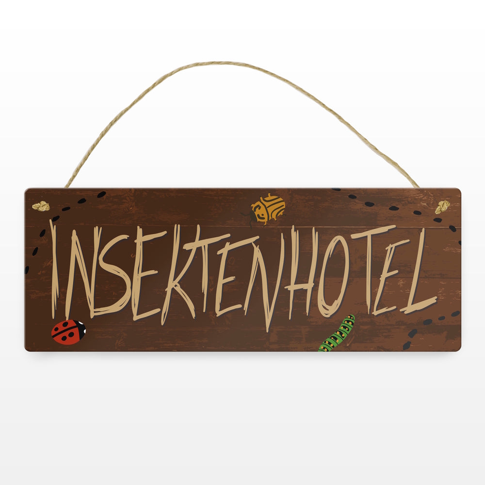 Das Insektenhotel Metallschild mit Holzoptik ist eine dekorative und originelle Idee, um Ihr eigenes Insektenhaus zu verschönern. Dieses hochwertige Schild aus Aluminiumblech ist in den Größen 7,5x20 cm und 10,5x28 cm erhältlich und wird in unserer Schilder-Manufaktur in Deutschland mit Sorgfalt in Handarbeit hergestellt. Es verfügt über vorgebohrte Löcher und abgerundete Ecken. Das Schild ist ein tolles Geschenk zu Geburtstagen, Ostern oder anderen Anlässen für Freunde, Familie und Nachbarn. Es eignet sich besonders gut als Tür- oder Wohnungsschild (Befestigungsmaterial nicht im Lieferumfang enthalten). Mit diesem Insektenhotel Metallschild können Sie Ihrem Garten einen neuen Look verleihen und gleichzeitig Ihren kleinen tierischen Bewohnern helfen.