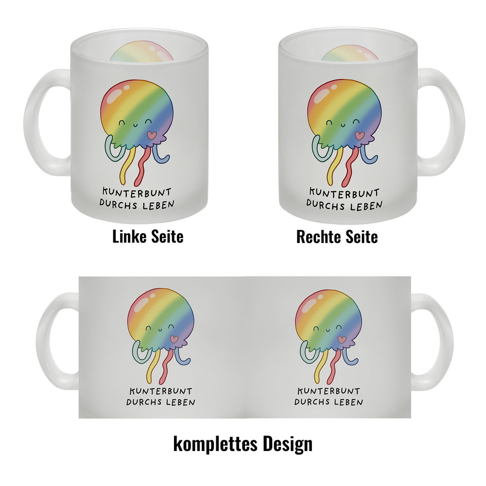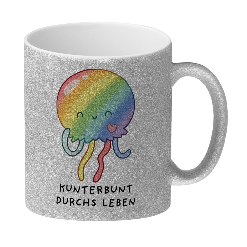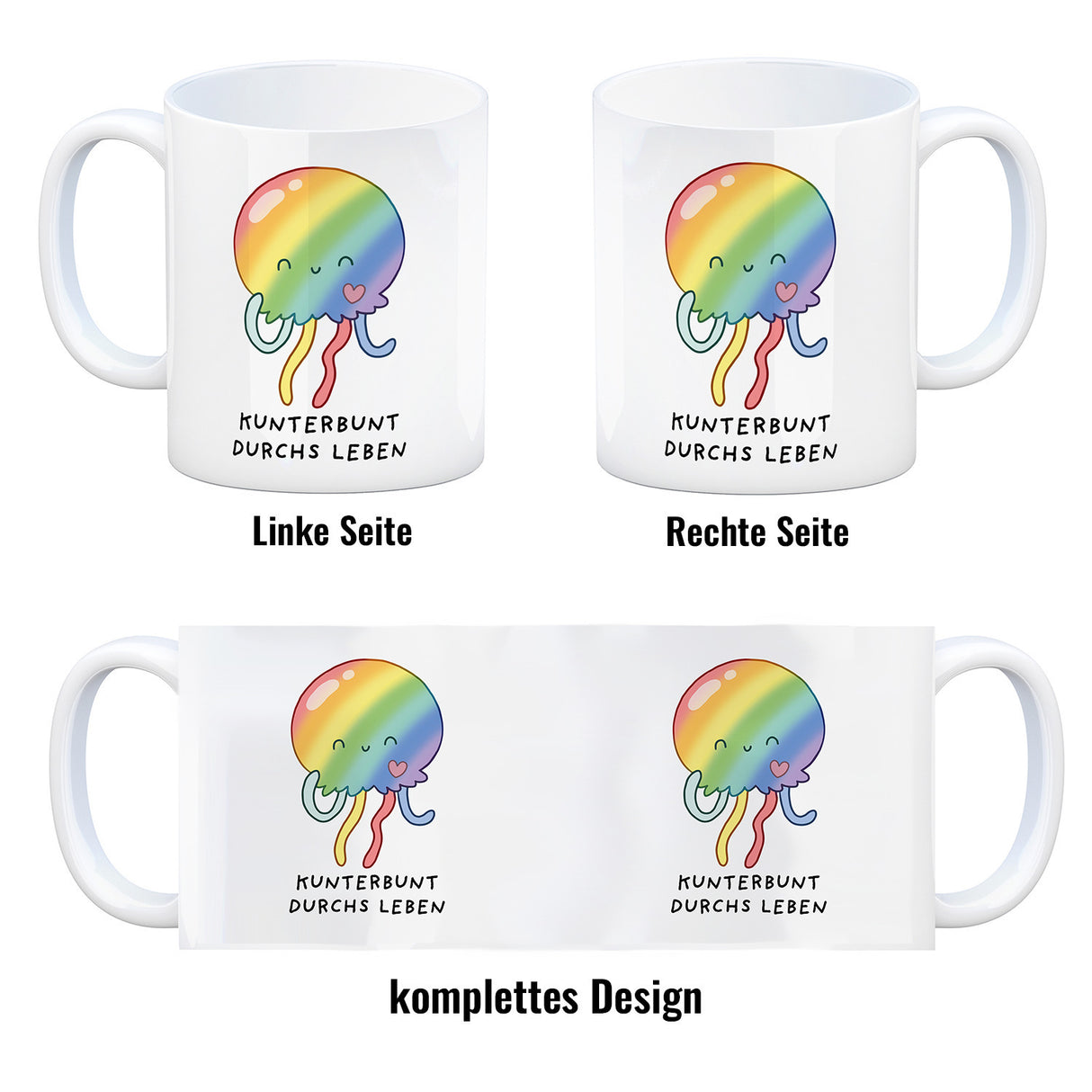 - 1x Jelly & Friends Regenbogen-Qualle Kaffeebecher mit Spruch Kunterbunt durchs Leben in der gewählten Ausführung
