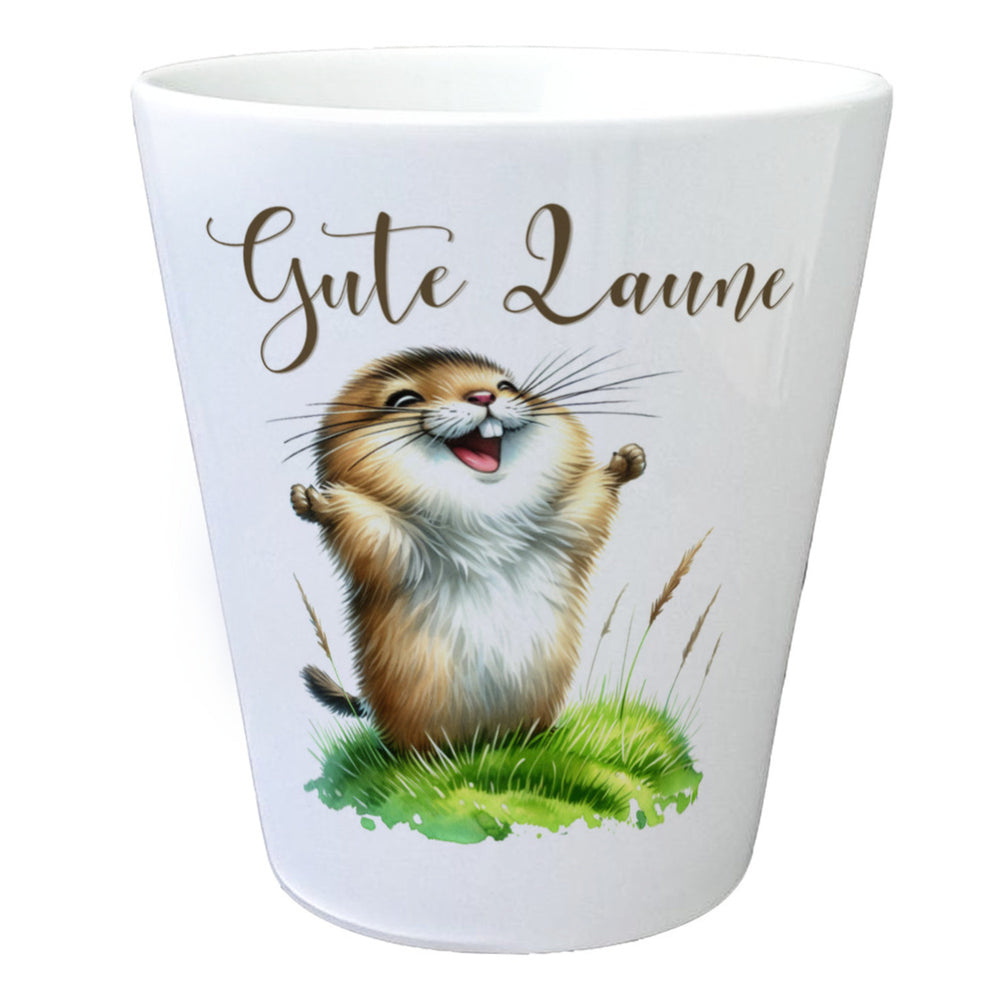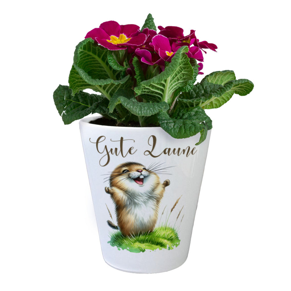 jubelnder Lemming Blumentopf mit Spruch Gute Laune
