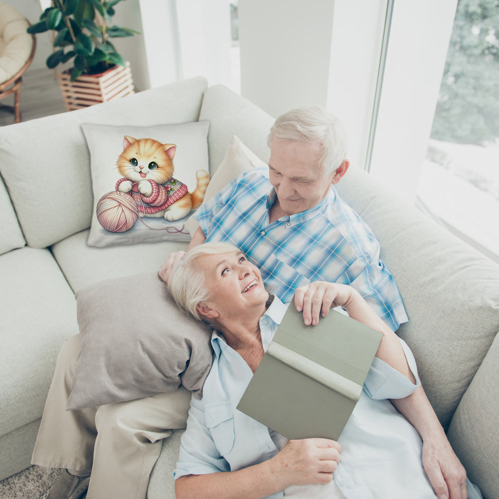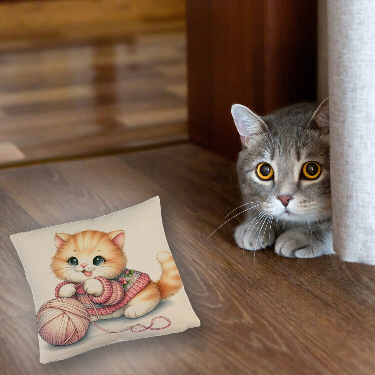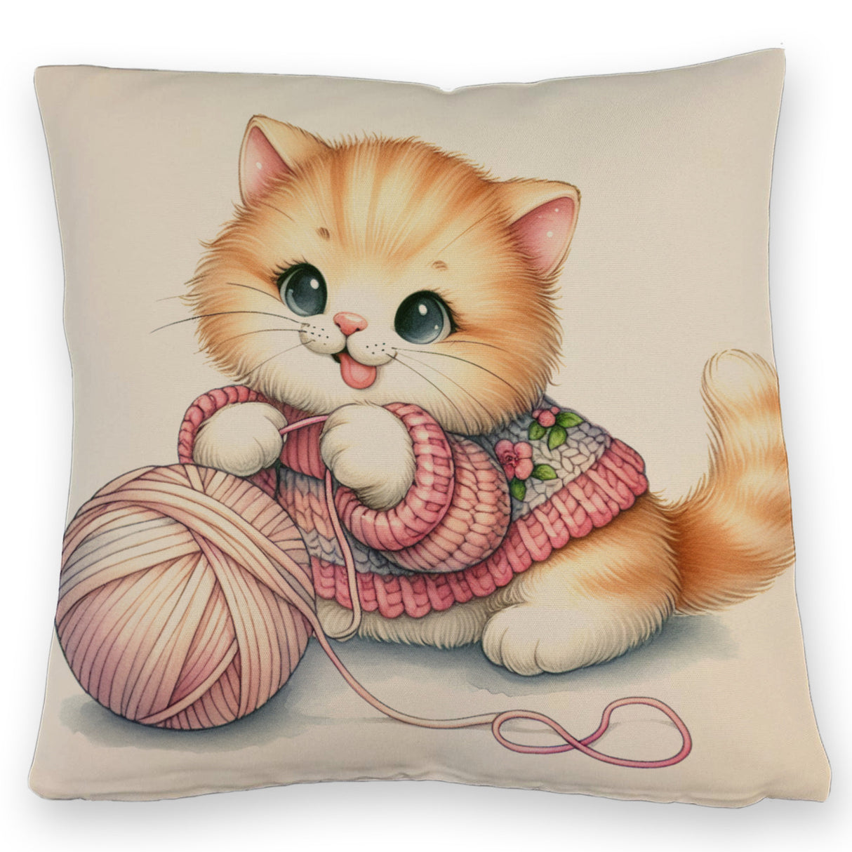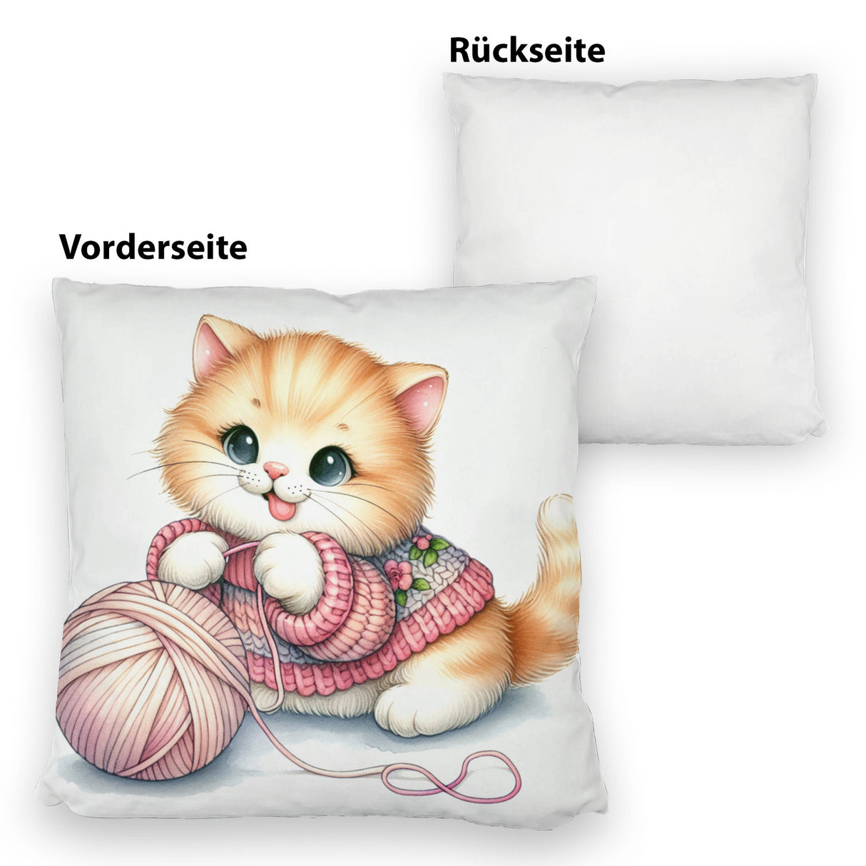 - Kuschel-Alarm! Unser Katzenbaby mit Wollknäuel Kissen bringt die Purr-fektion in dein Zuhause. Ein flauschiges Kätzchen, das sich mit einem bunten Woll-Ball vergnügt – zu süß, um wahr zu sein, oder? Holt euch schnurrende Träume auf’s Sofa!