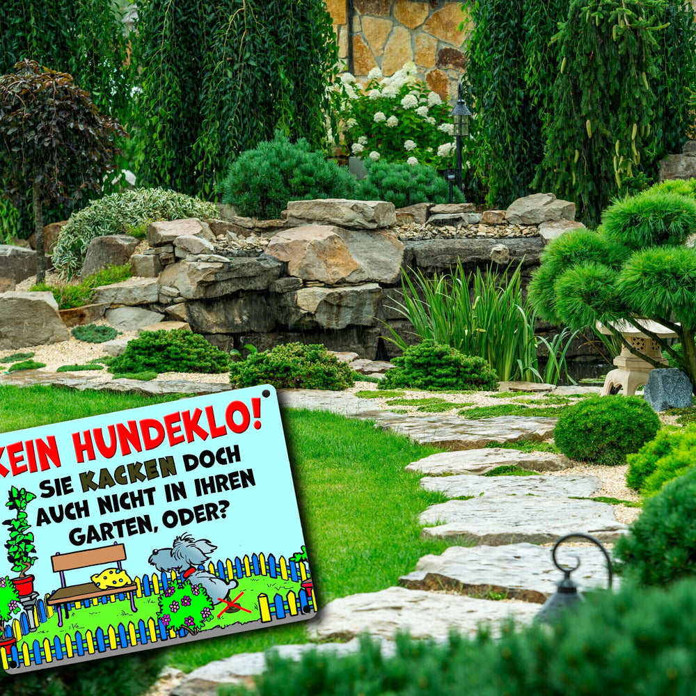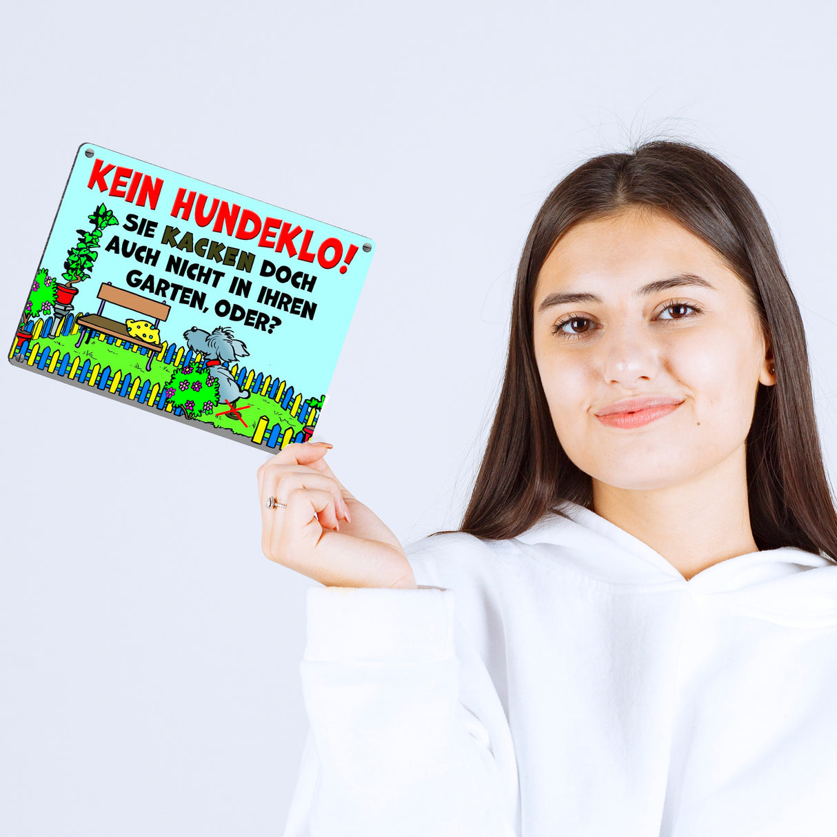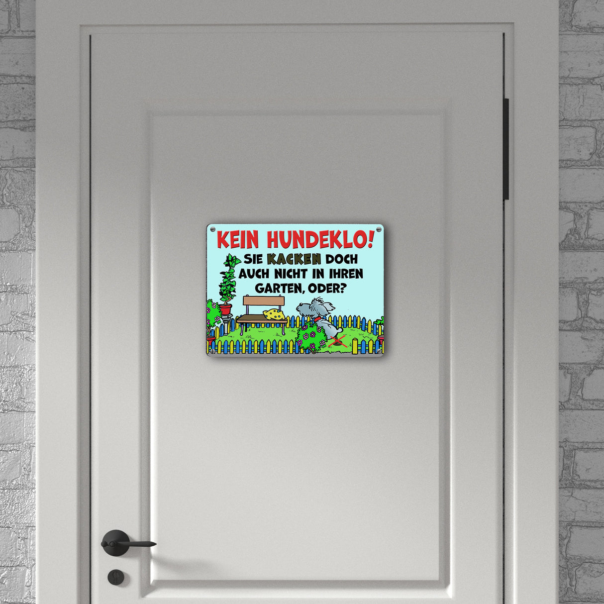 Das Metallschild zeigt einen kackenden Hund in einem Vorgarten sowie den Spruch: Kein Hundeklo! Sie kacken doch auch nicht in Ihren Garten, oder? Hinweise: Material: Aluminium / Dicke: 0,5 mm