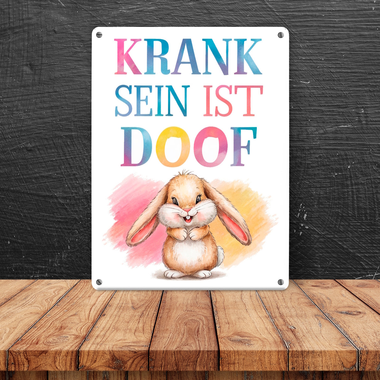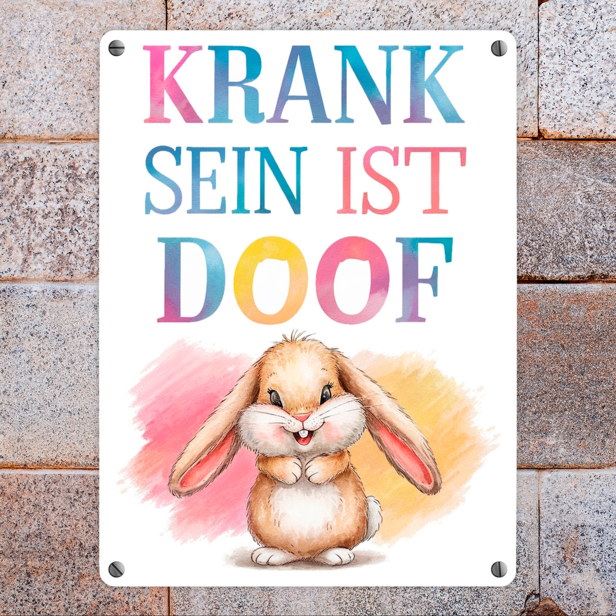 - Dieses Metallschild zeigt ein charmantes Hase-Motiv: Ein fröhlicher Hase mit schlaffen Ohren und flauschigem Schwanz lächelt auf einem sanften Pastellhintergrund. In bunten Buchstaben steht "KRANK SEIN IST DOOF", umrahmt von fröhlichen Farbspritzern. Eine warme Umarmung in Metall! Perfekt für Ihre Wand!