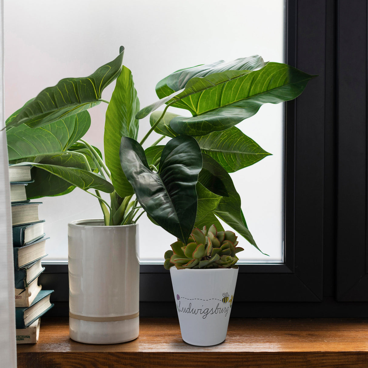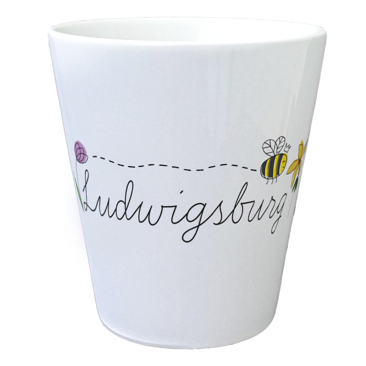 • Dieser Ludwigsburg Blumentopf zaubert mit seinem fröhlichen Design jedem ein Lächeln ins Gesicht! Der verspielte Schriftzug 'Ludwigsburg' in schwarzer Schrift wird von bunten Blumen und einer lustigen Biene begleitet. Der schlichte weiße Hintergrund lässt das farbenfrohe Motiv besonders strahlen und zieht alle Blicke auf sich.