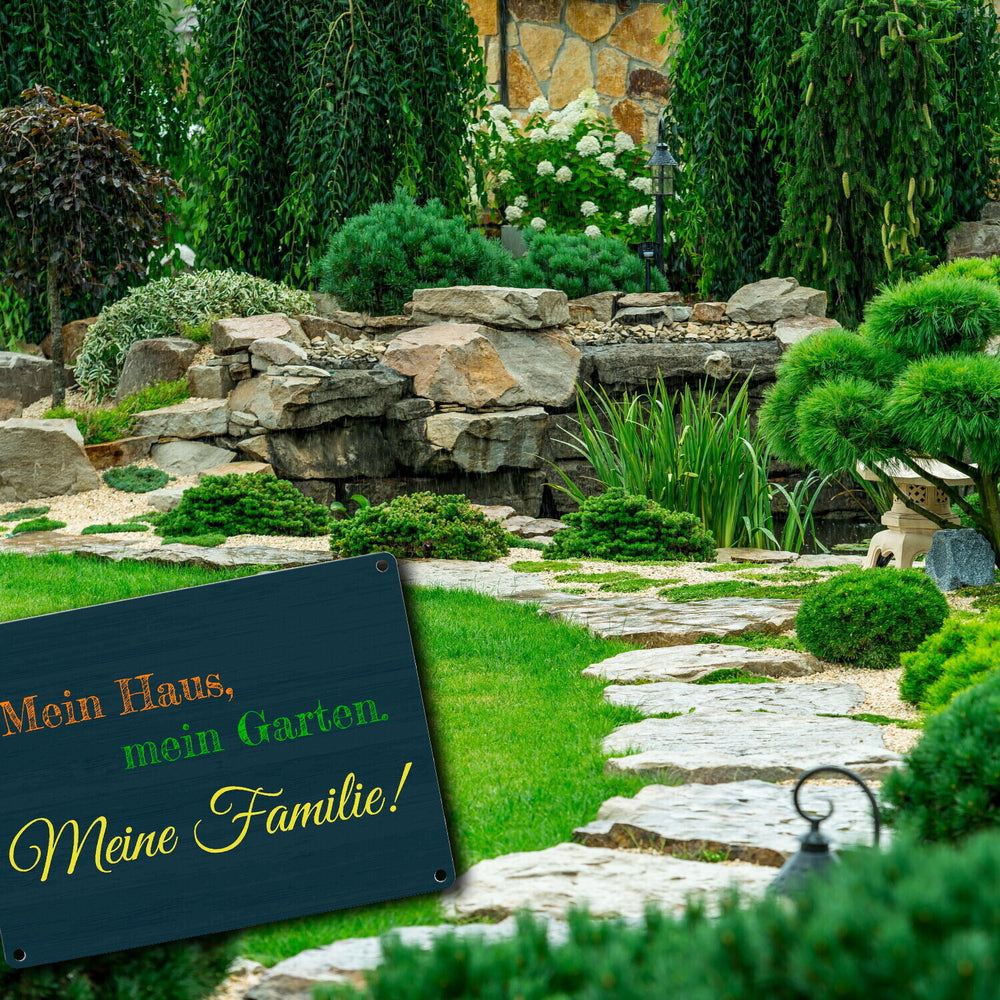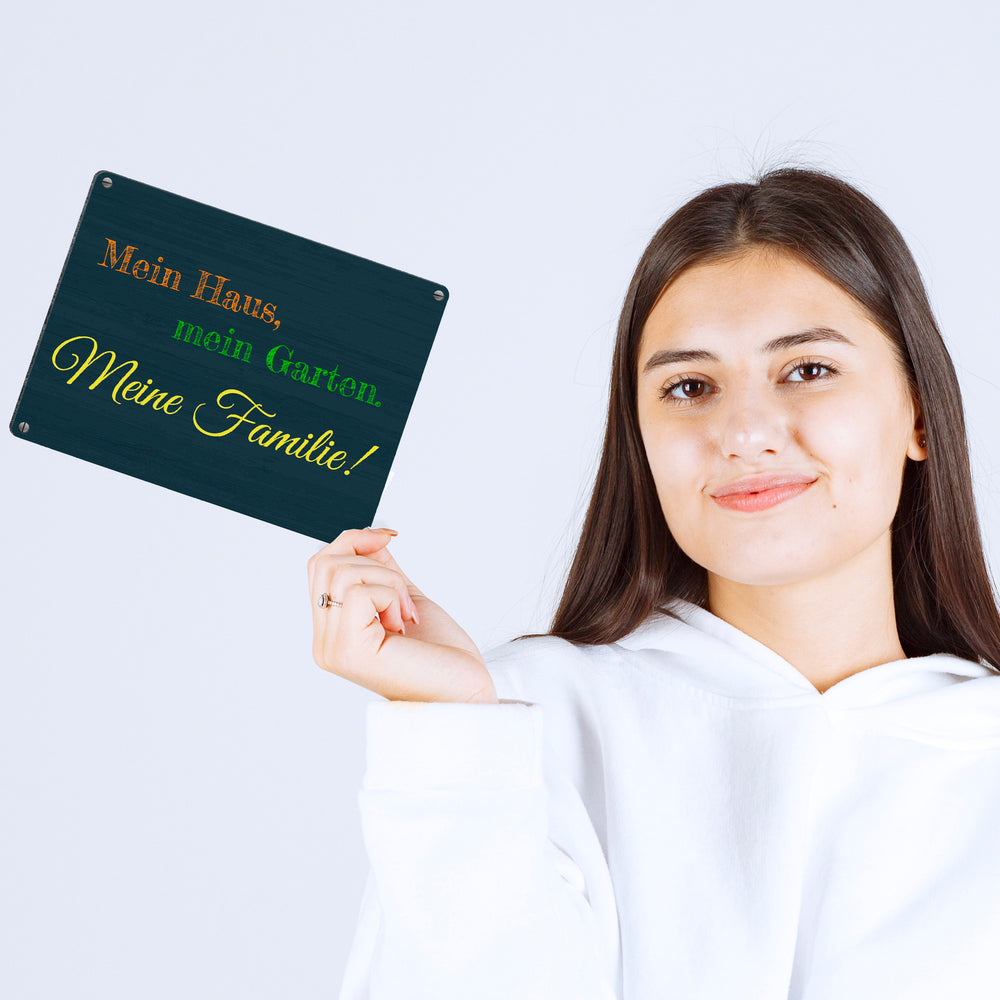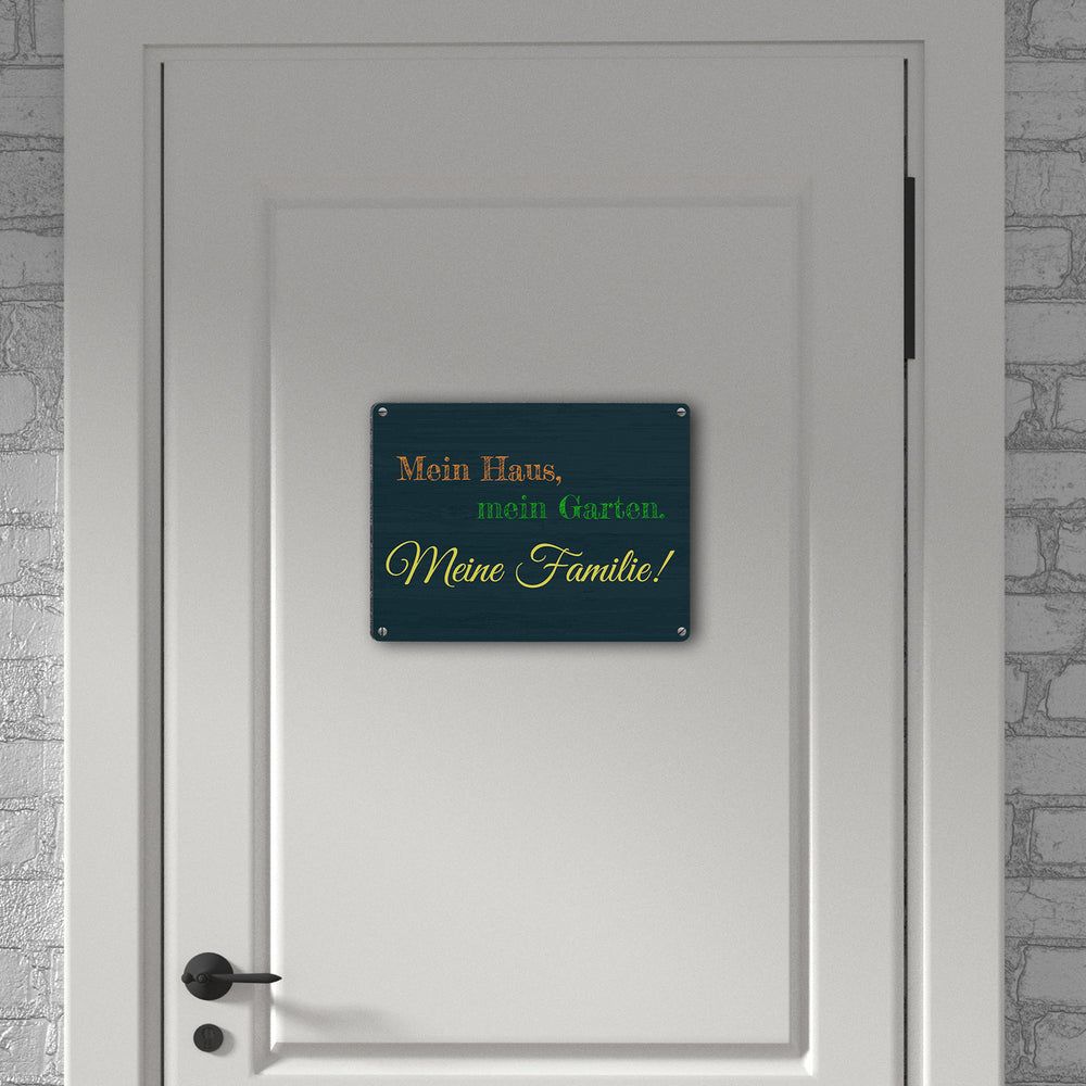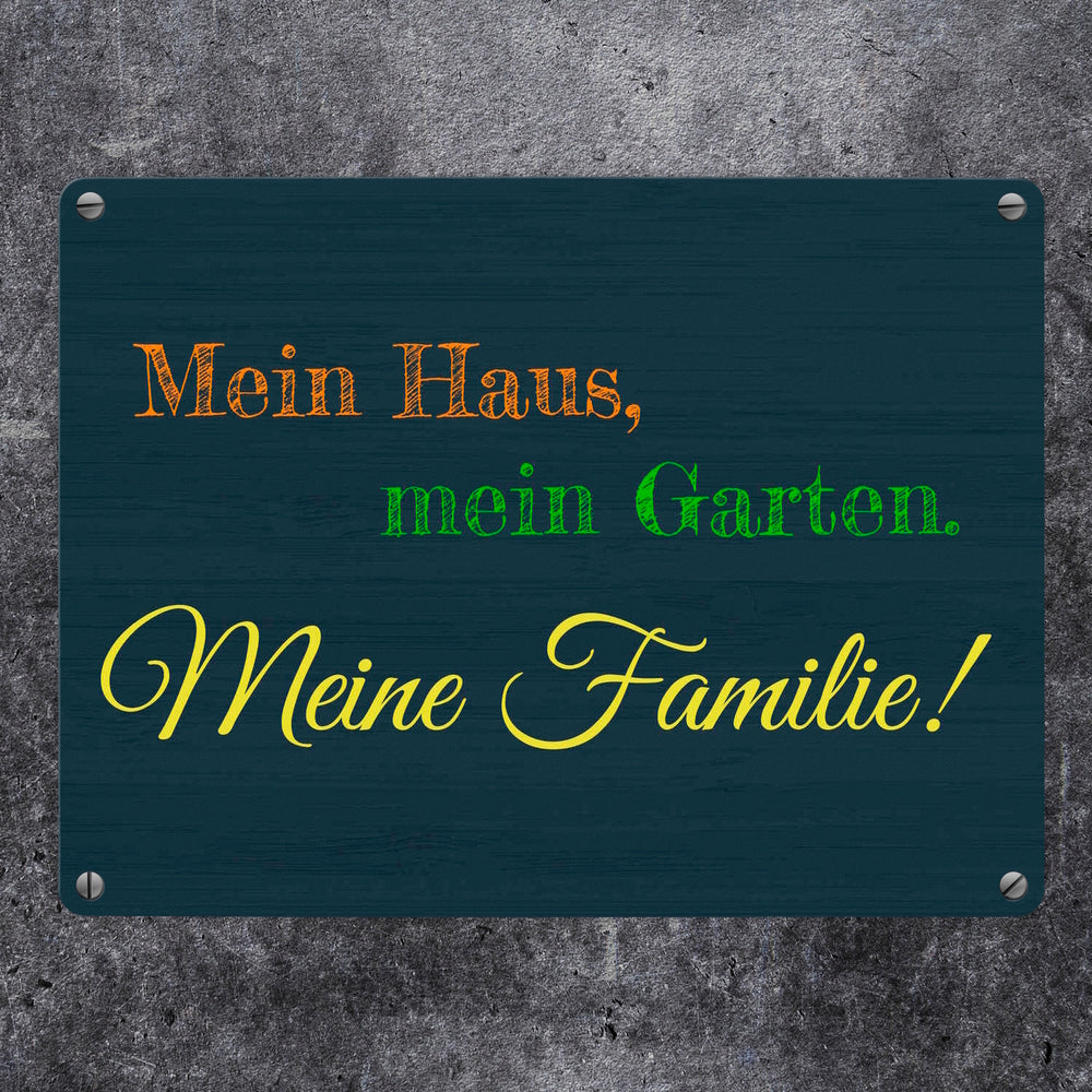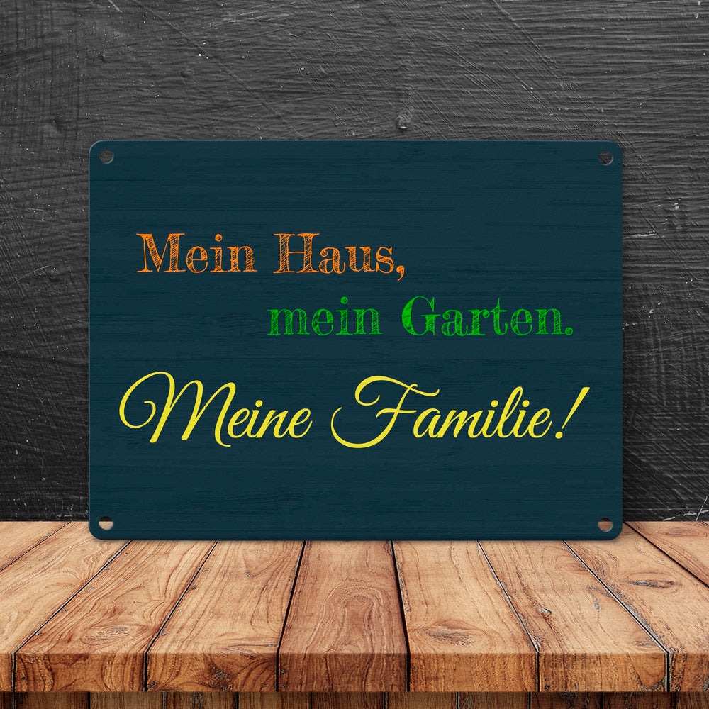 Mein Haus, mein Garten. Meine Familie Metallschild in 15x20 cm mit Spruch
