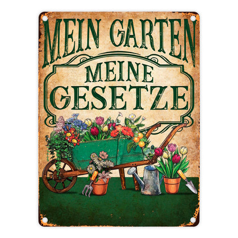Mein Garten Meine Gesetze Metallschild in 15x20 cm mit Blumenwagen