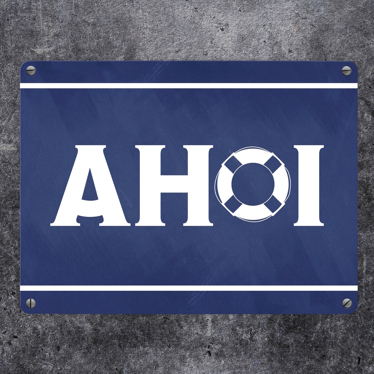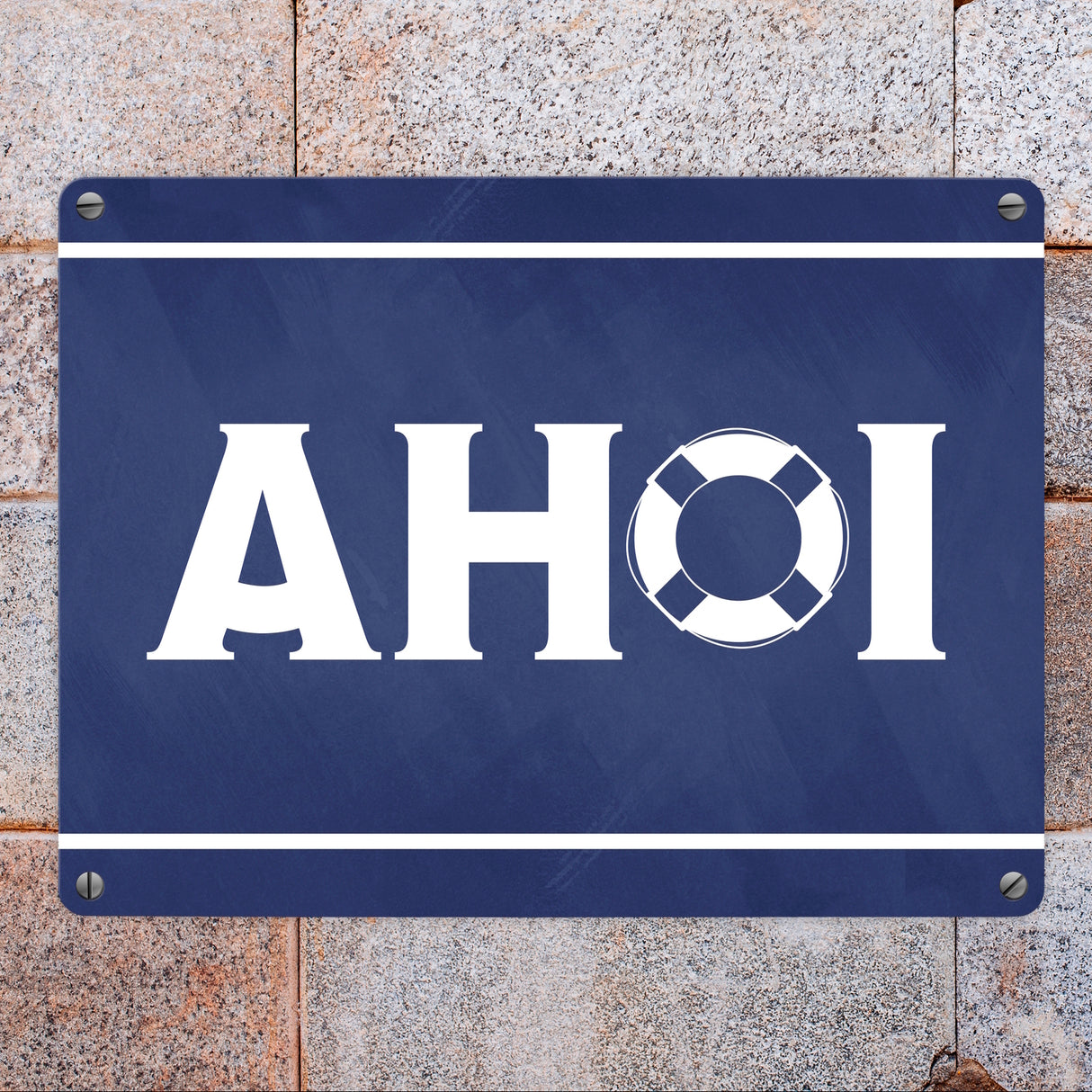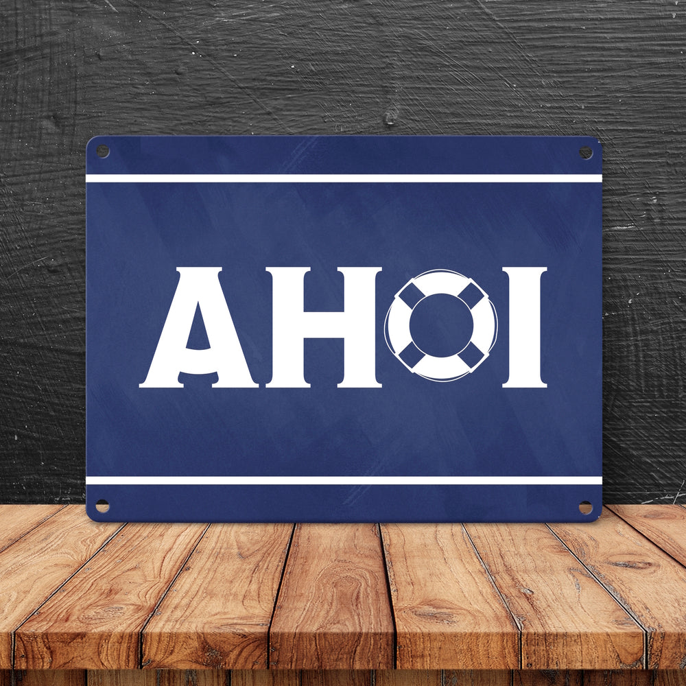 - 1x Metallschild Ahoi - mit Maritim Rettungsring Motiv in der gewählten Größe