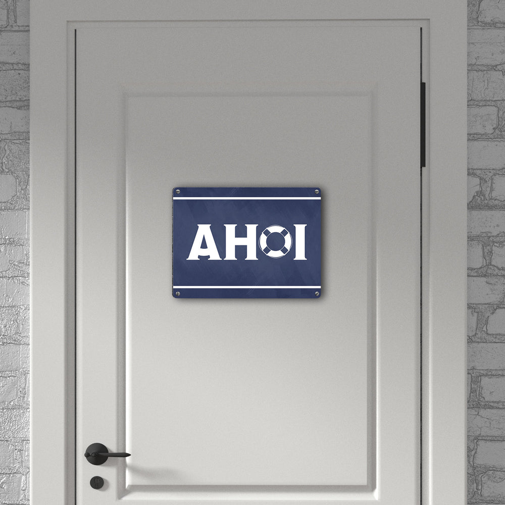 Metallschild mit maritimen Design - Ahoi Schriftzug mit Rettungsring Motiv