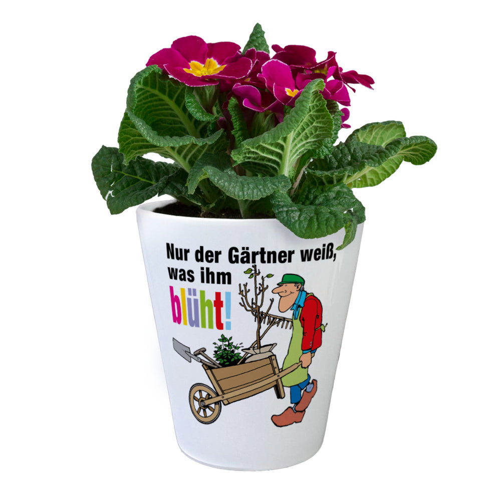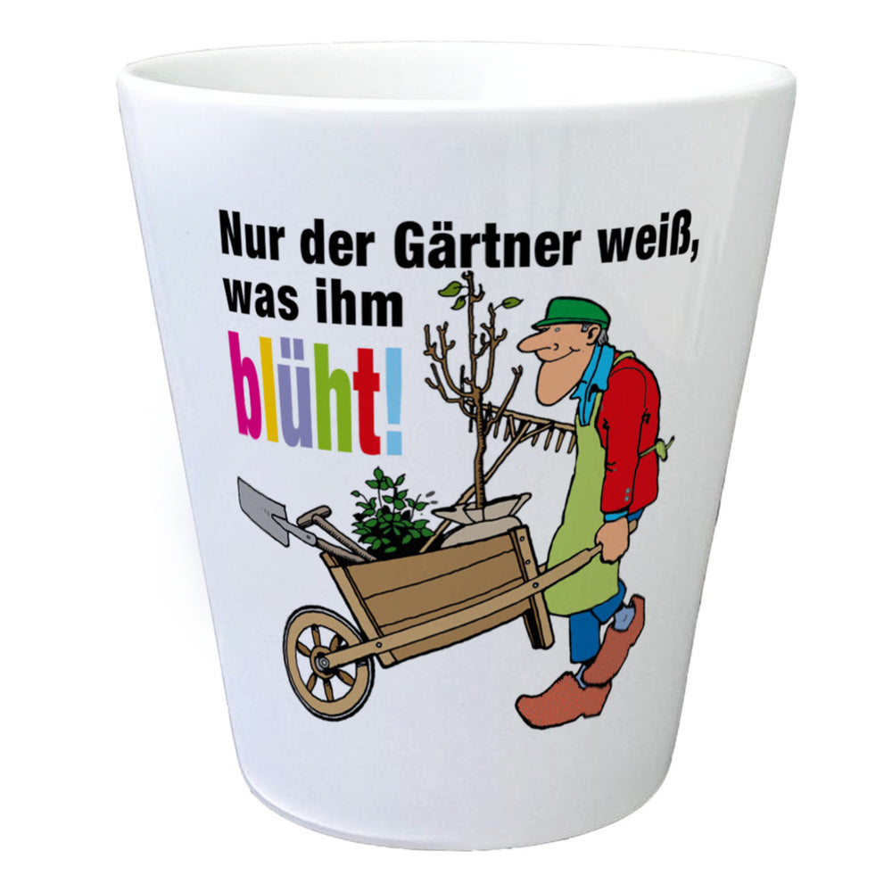 - Der lustige Blumentopf zeigt einen Gärtner im Comicstil, der fleißig mit seinem Schubkarren voller Pflanzen unterwegs ist. Der freche Spruch "Nur der Gärtner weiß, was ihm blüht!" ziert diesen einzigartigen Topf und bringt jeden Pflanzenliebhaber zum Schmunzeln. Perfekt für alle, die gerne im Garten werkeln!