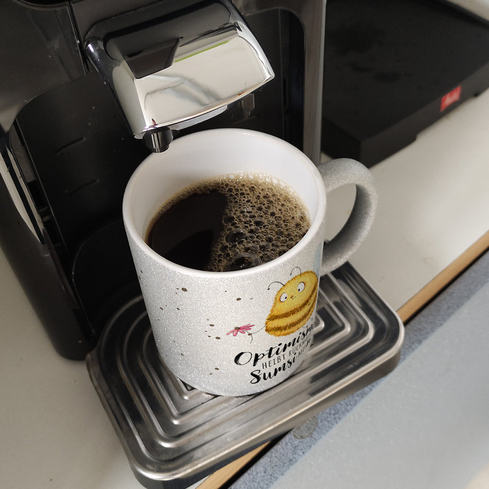 - 1x Pummel Biene Kaffeebecher mit Spruch Optimismus heißt rückwärts Sumsi mit Po in der gewählten Ausführung