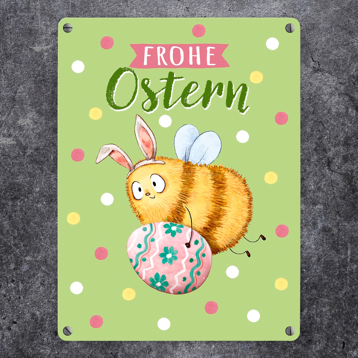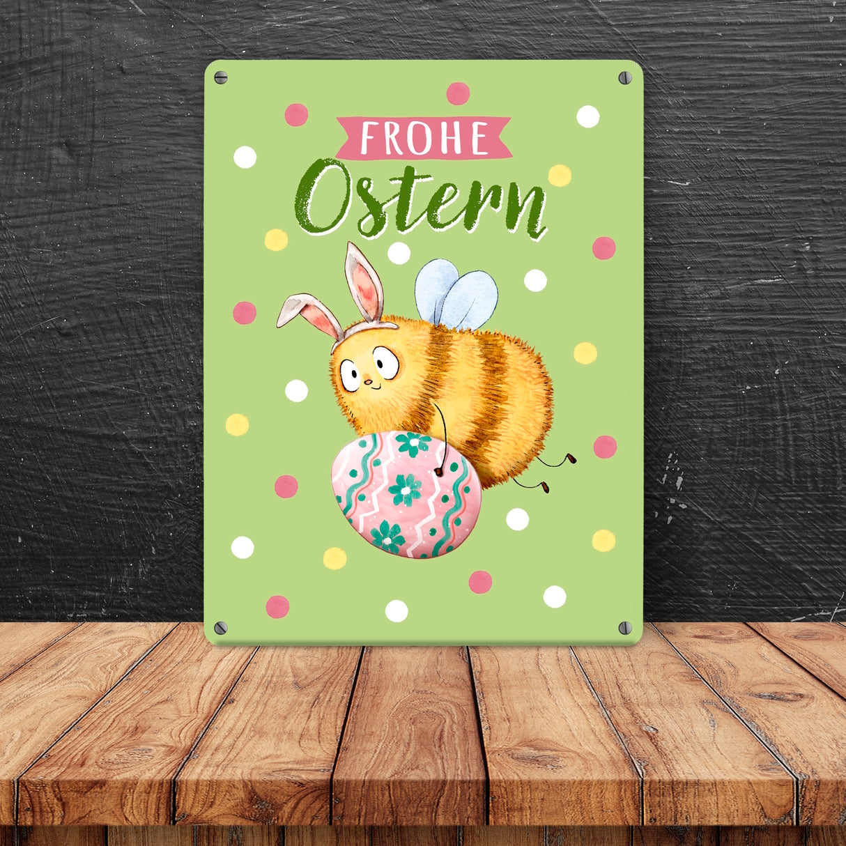 Pummel Biene Metallschild in 15x20 cm mit Spruch Frohe Ostern - 15x20 cm ist auf Lager und wird versandt, sobald es wieder verfügbar ist