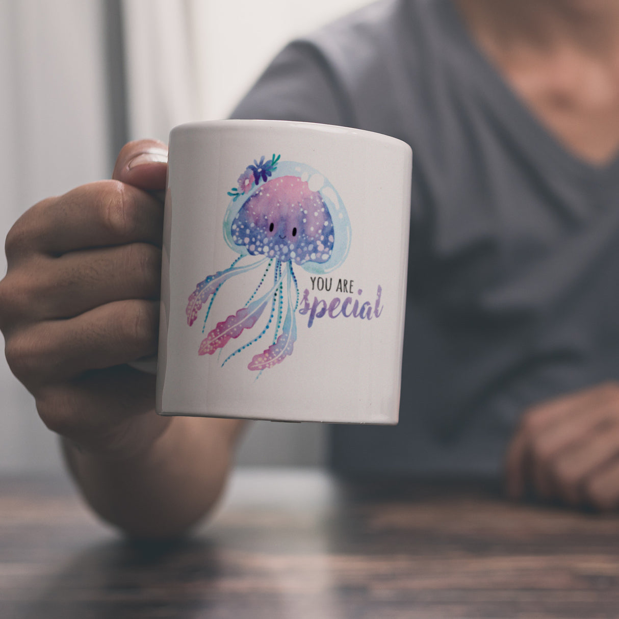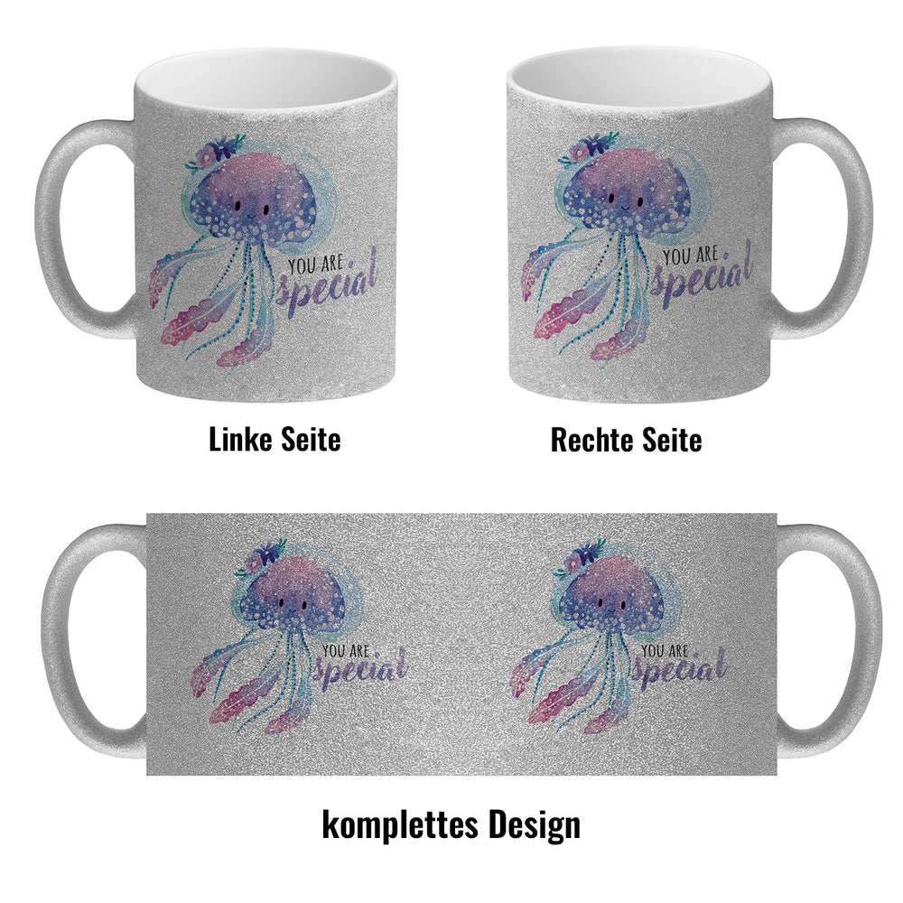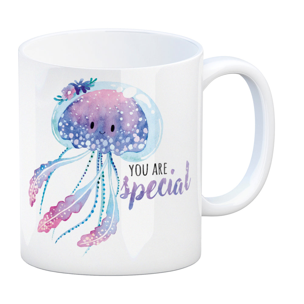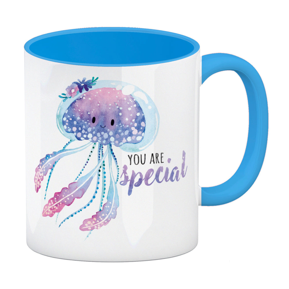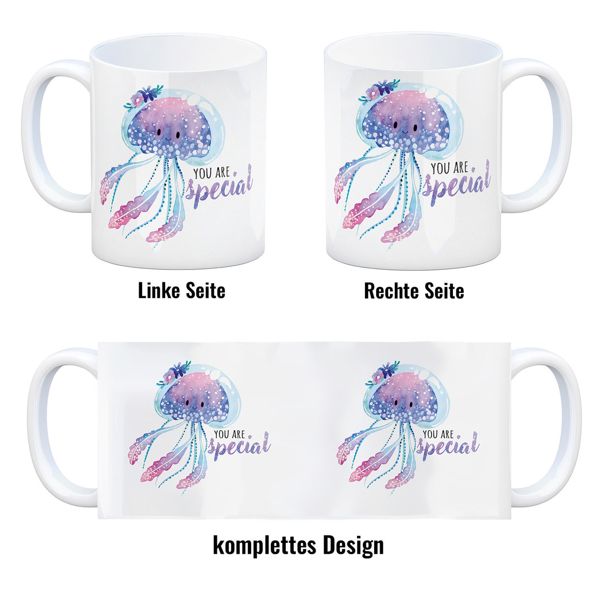 • 1x Qualle Kaffeebecher mit Spruch You are special in der gewählten Ausführung