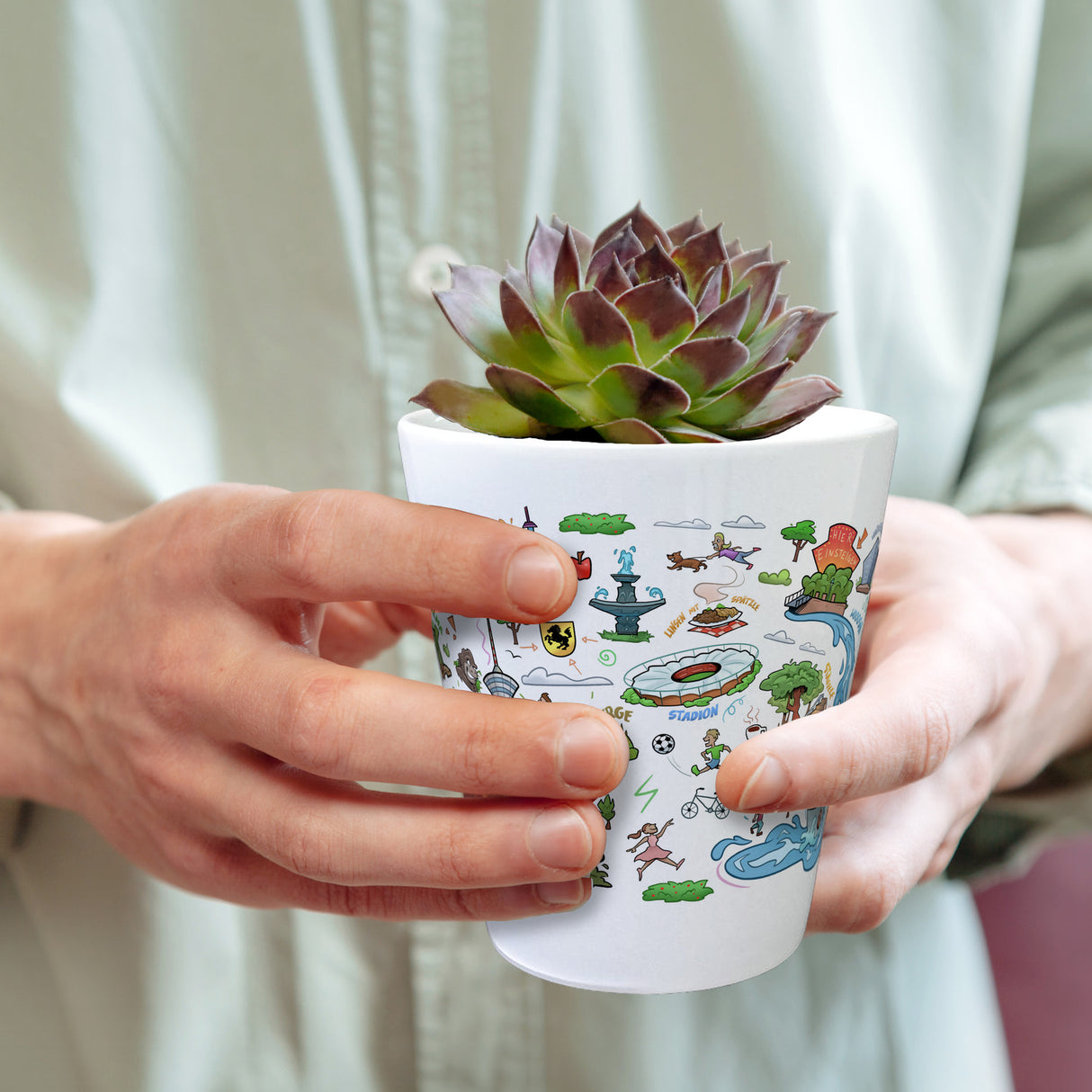Der Stuttgart Pop Art Comic Blumentopf ist ein farbenfroher Hingucker! Mit einem lebhaften Wimmelbild im Comicstil fängt er das urbane Feeling Stuttgarts ein. Vom Fernsehturm bis zur Wilhelma sind Schlüssellandmarken detailreich dargestellt. Der dynamisch Hinweise: Material: Keramik / Höhe: ca. 10 cm, Durchmesser oben: ca. 9cm / Mit Bodenloch zur Vermeidung von Staunässe.