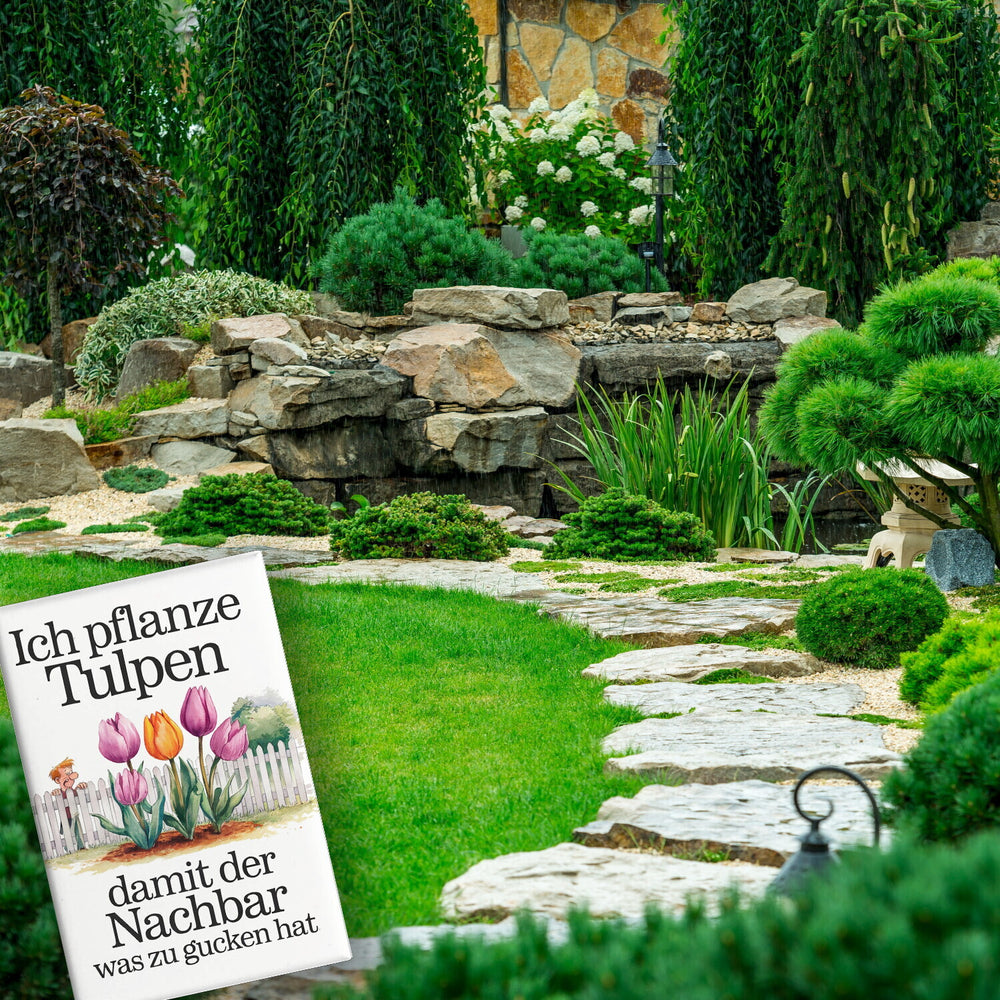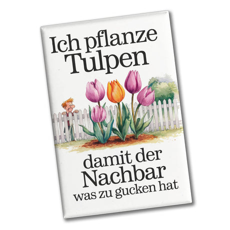 - Dieser rechteckige Magnet kombiniert humorvolle Kunst mit einem Hauch von Gartenzauber. Auf weißem Hintergrund in Aquarell-Pastellfarben steht der Spruch: "Ich pflanze Tulpen, damit der Nachbar was zu gucken hat." Eine Person pflanzt gigantische Tulpen, während ein neugieriger Nachbar über den Zaun lugt, um alles zu begutachten.