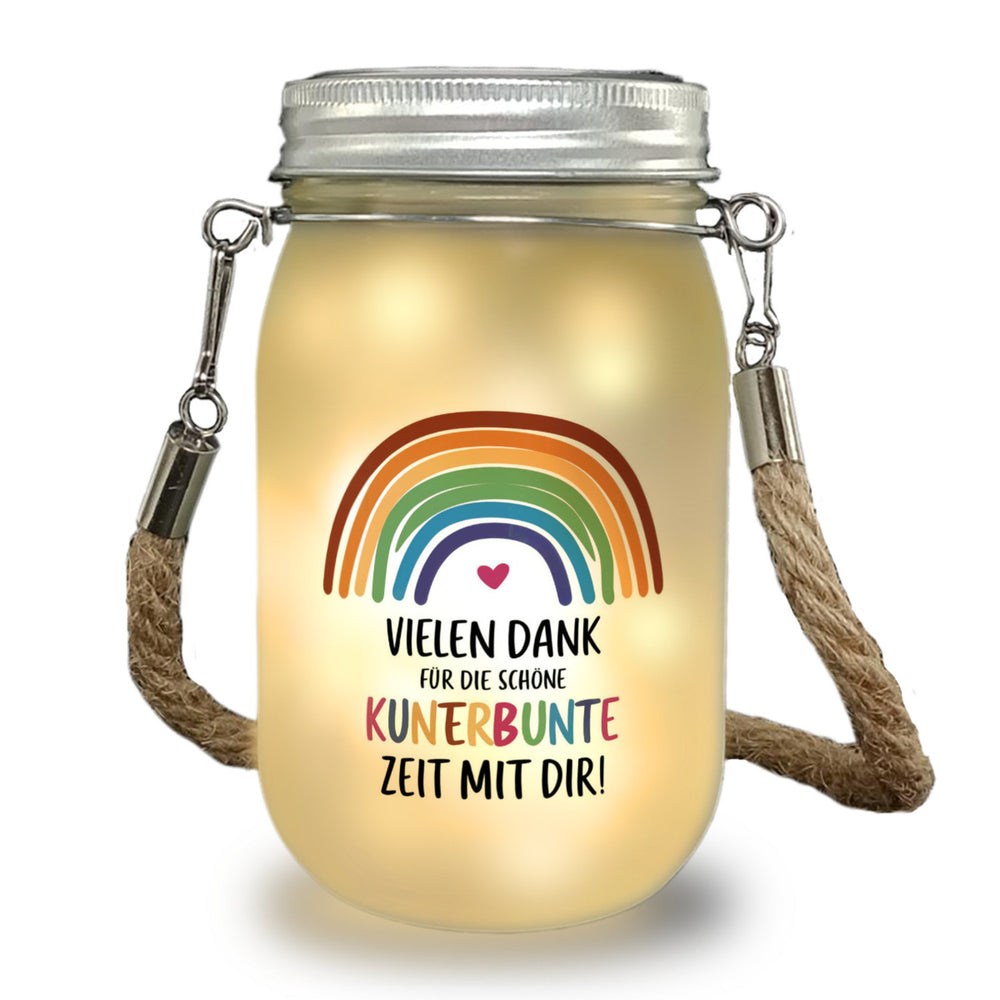 - Unsere Solarlaterne erstrahlt in den leuchtenden Farben eines lebendigen Regenbogens auf einem schlichten weißen Hintergrund. Darunter prangt die herzliche Botschaft: "Vielen Dank für die schöne kunterbunte Zeit mit dir!" – zentral und farbenfroh gestaltet. Diese einzigartige Kombination macht es zu einem Hingucker für jede Dekoration.