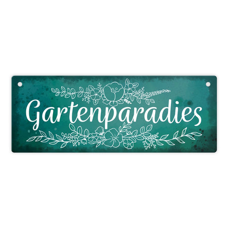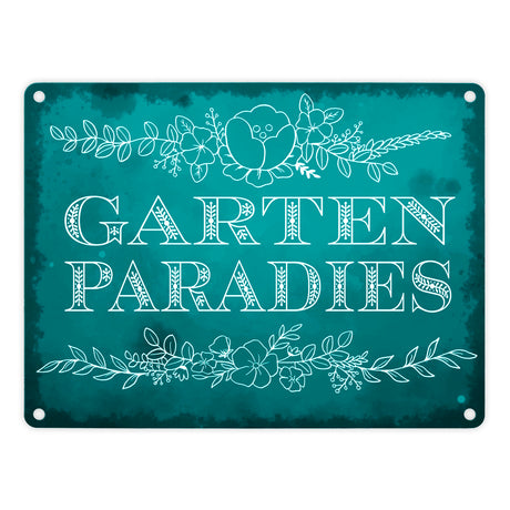 Gartenparadies Metallschild in türkis mit floralen Ornamenten