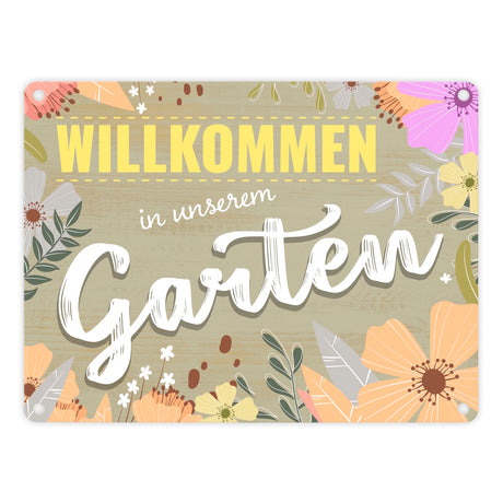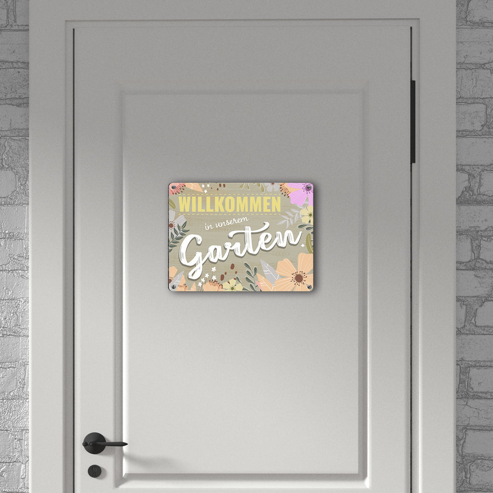 Willkommen in unserem Garten Metallschild mit Blumenmustern