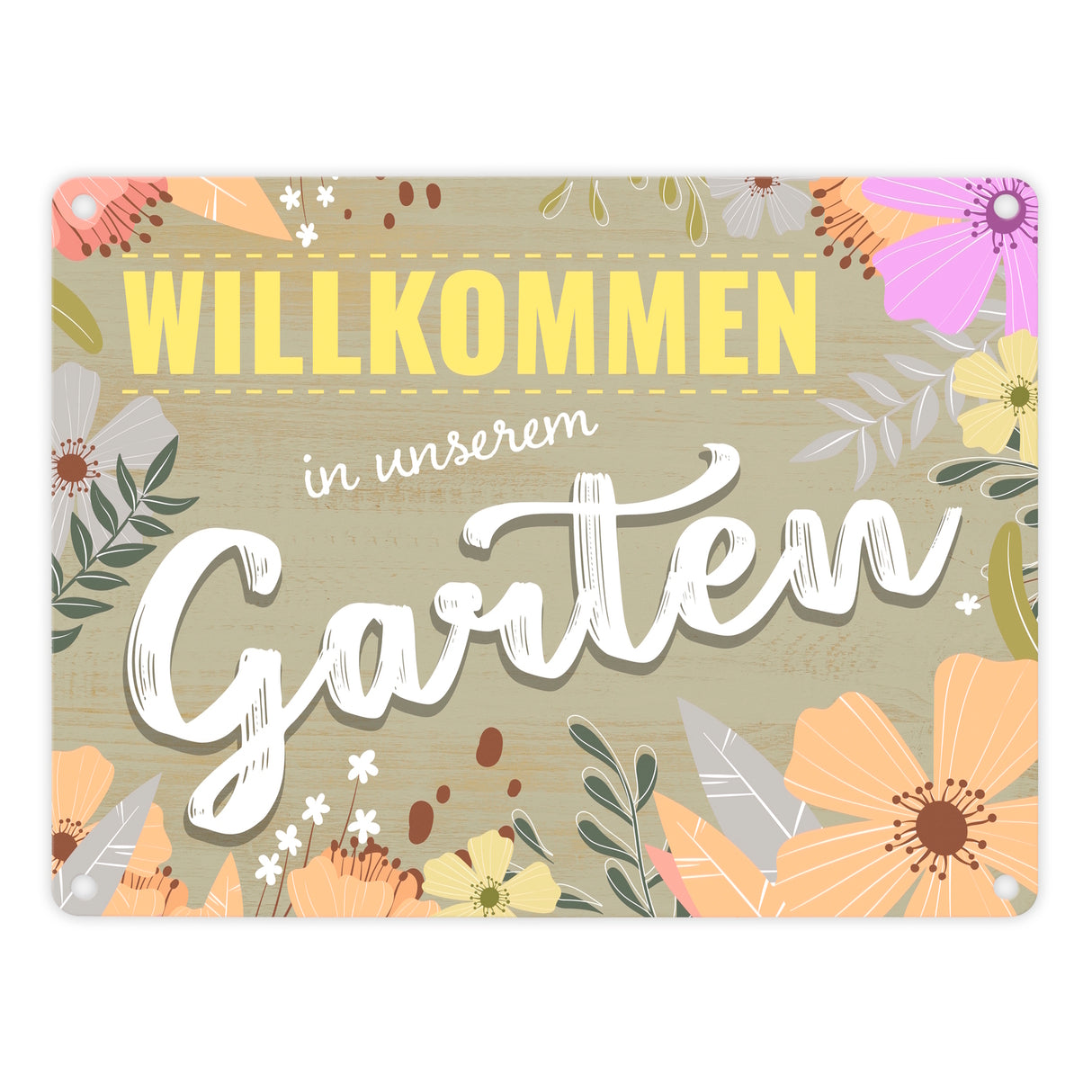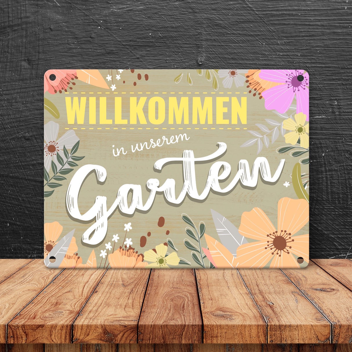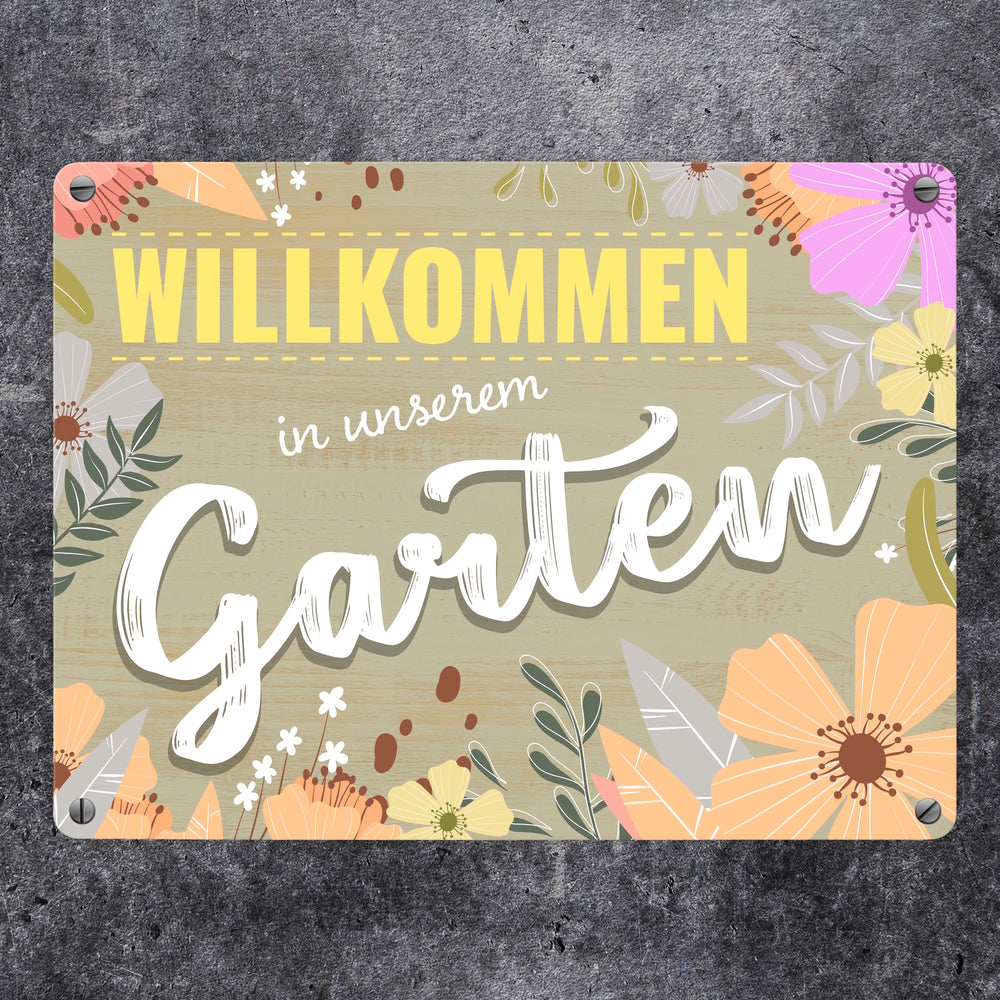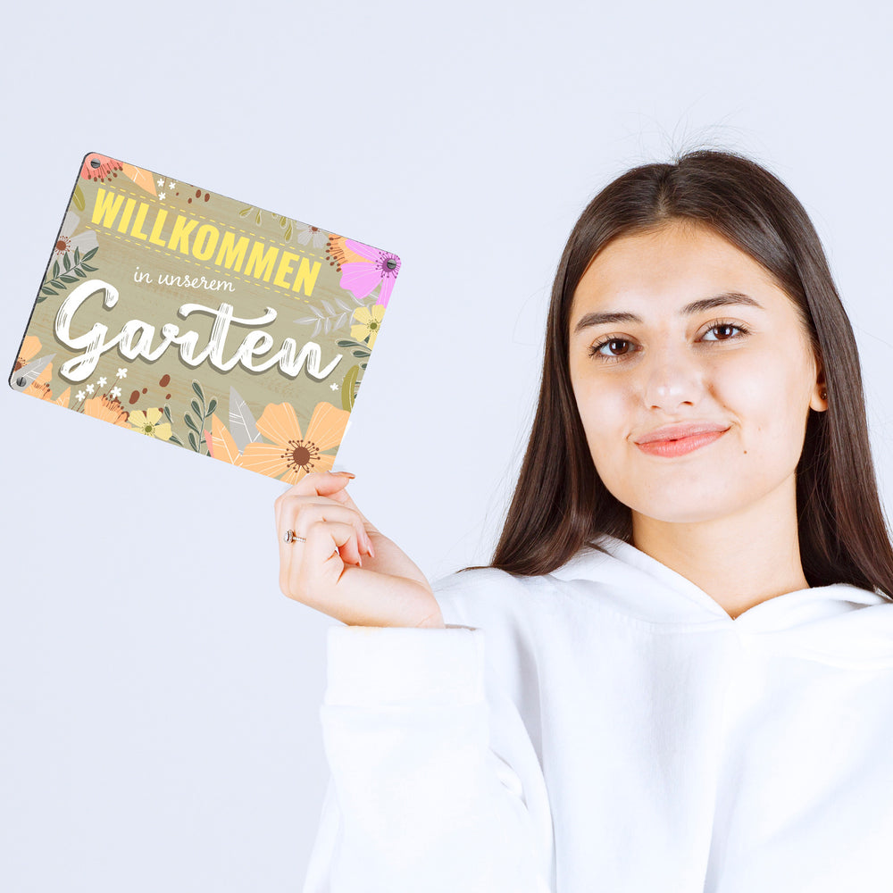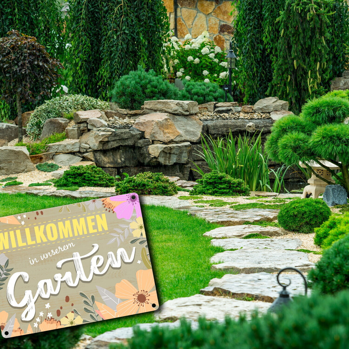 - 1x Willkommen in unserem Garten Metallschild mit Blumenmustern in der gewählten Größe