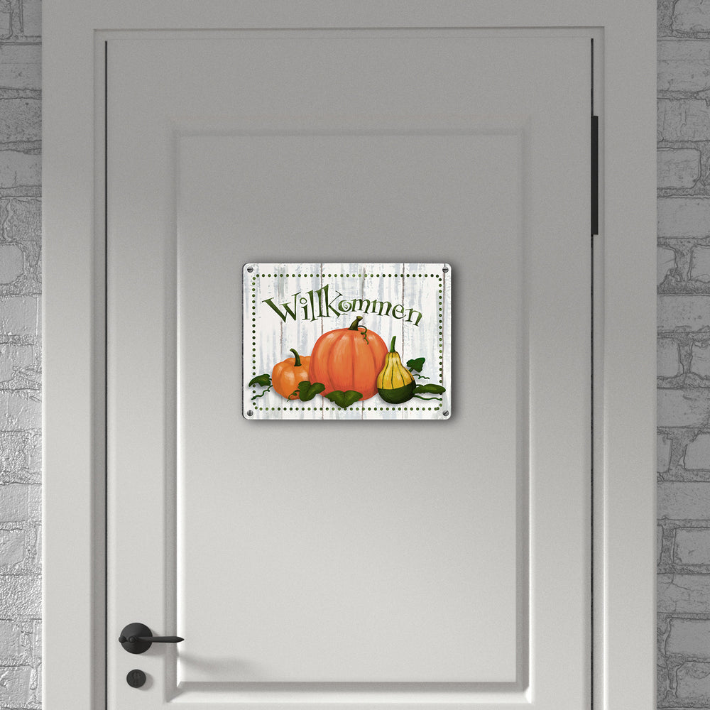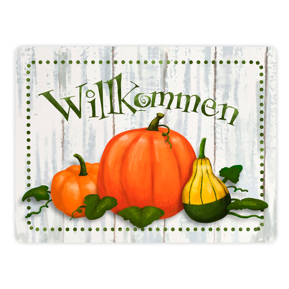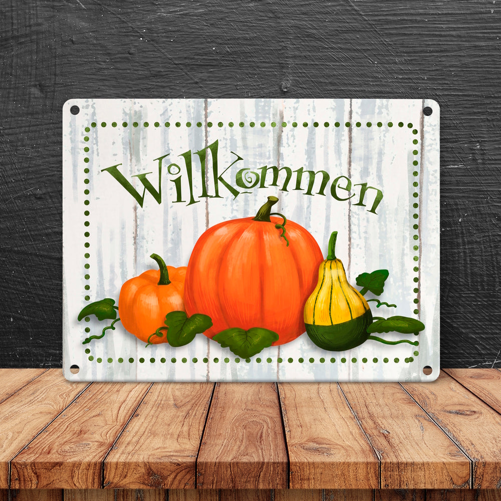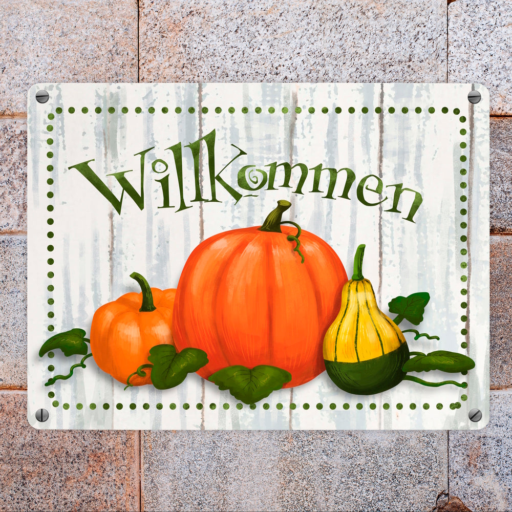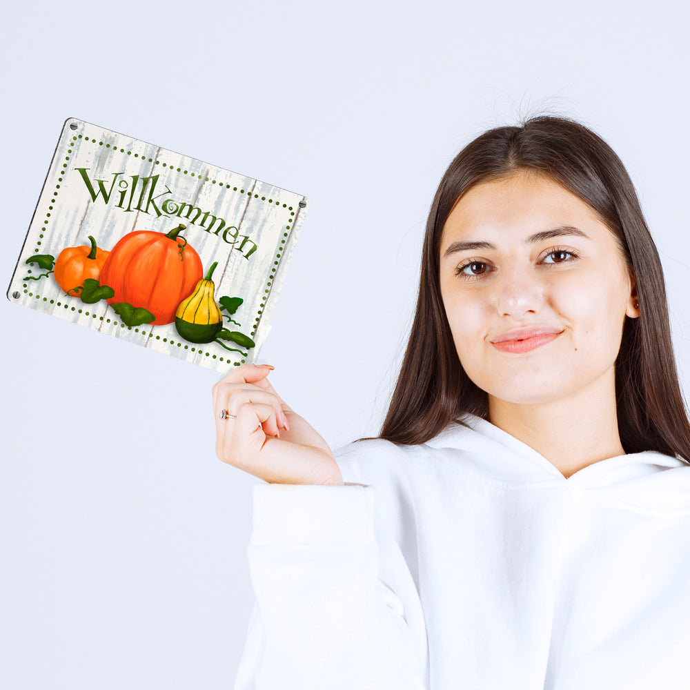 Willkommen Metallschild mit herbstlichen Kürbissen