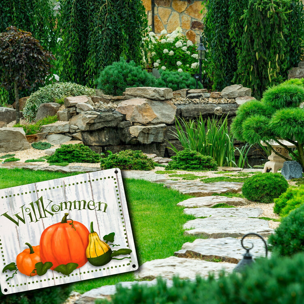 • 1x Willkommen Metallschild mit herbstlichen Kürbissen in der gewählten Größe