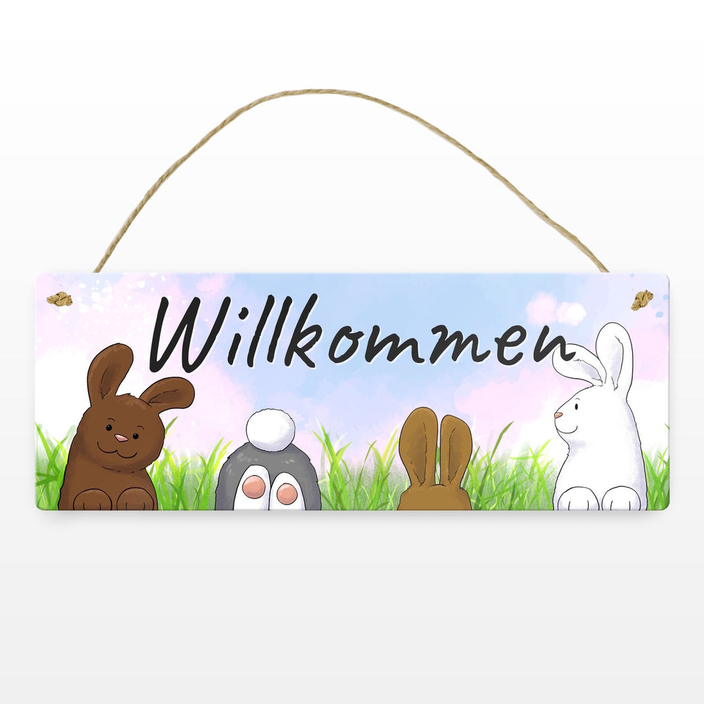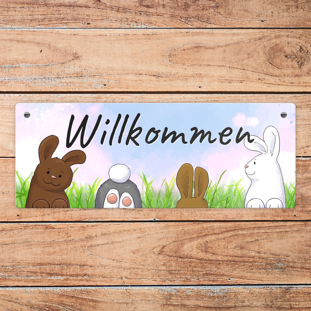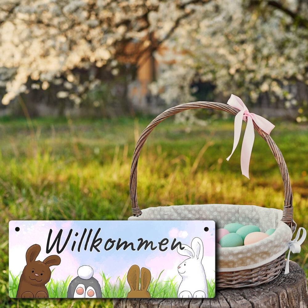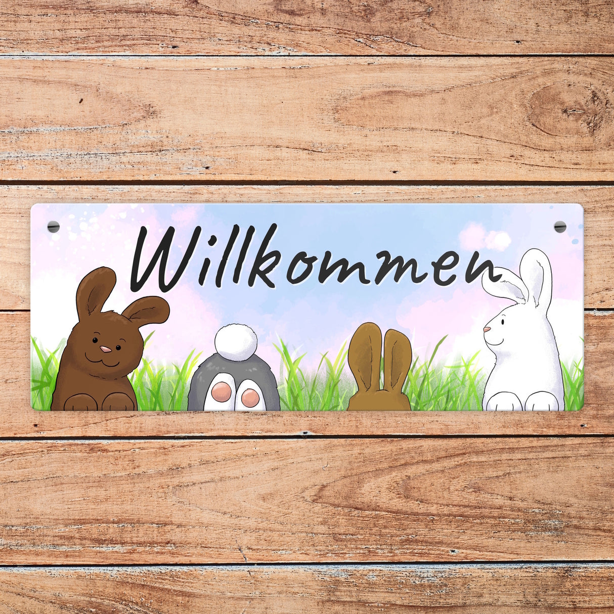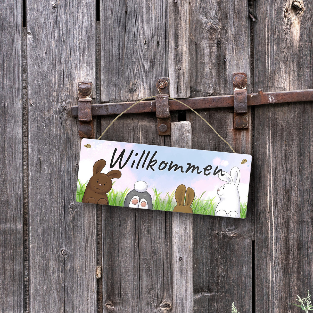 - 1x Willkommen Metallschild mit lustigem Hasen-Motiv in der gewählten Größe