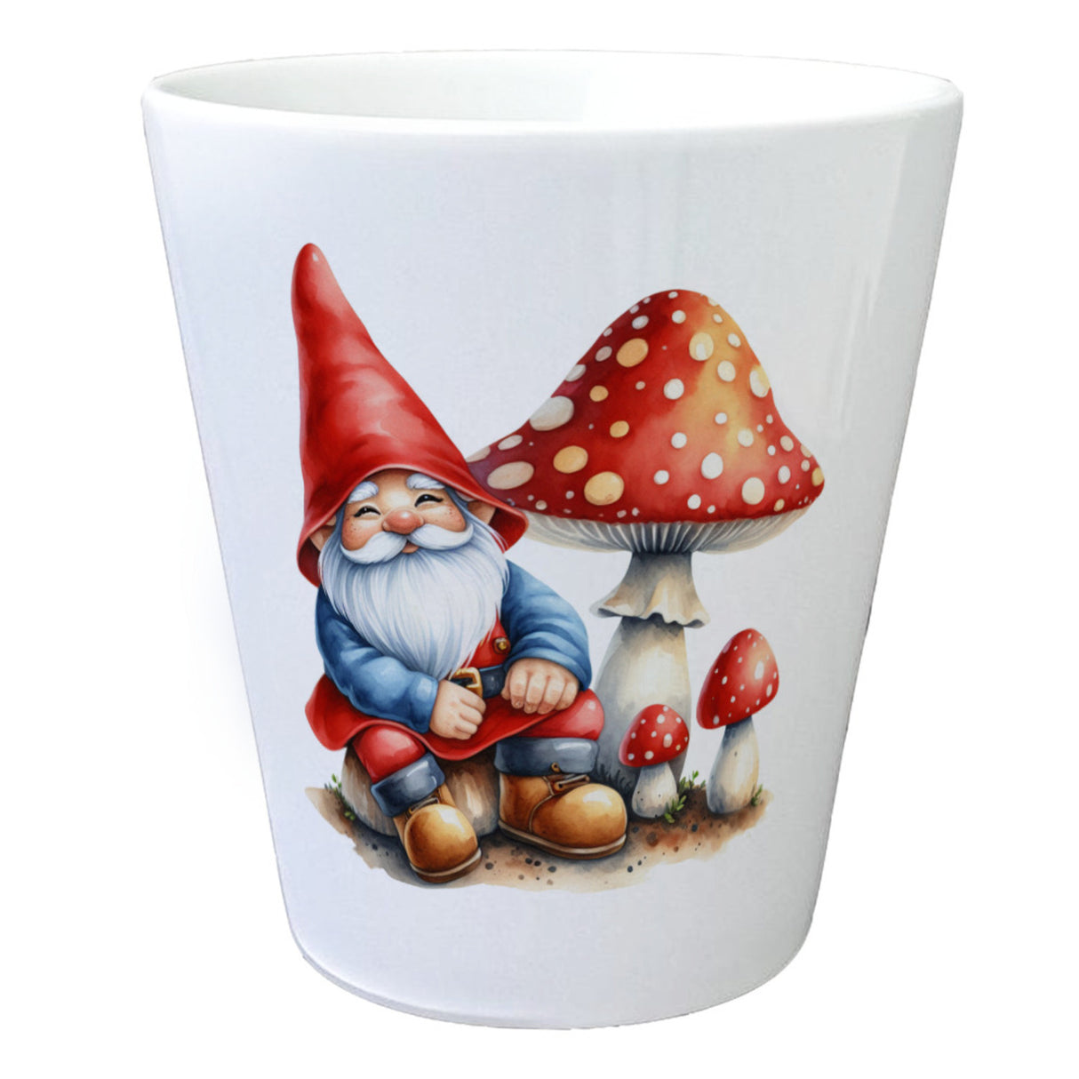 Gartenzwerg auf Fliegenpilz Blumentopf