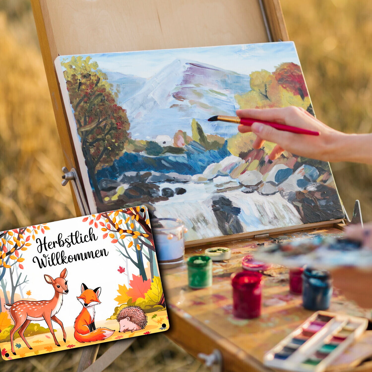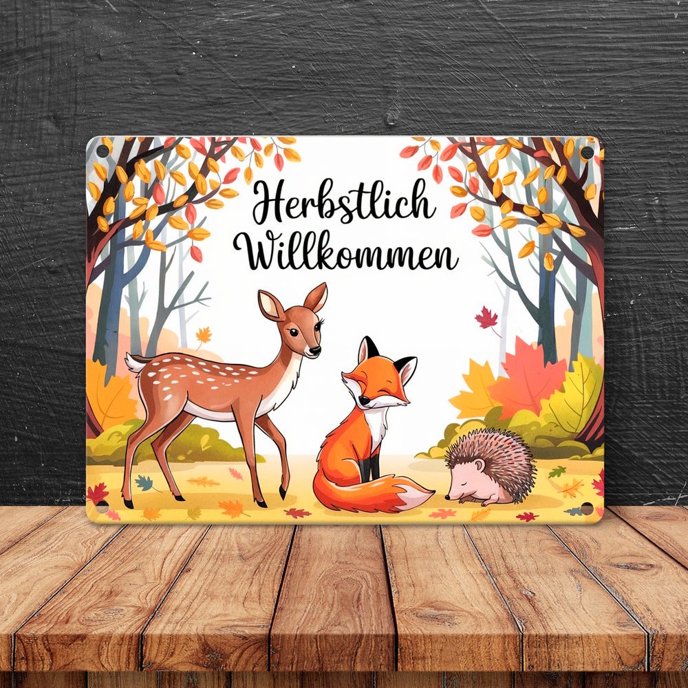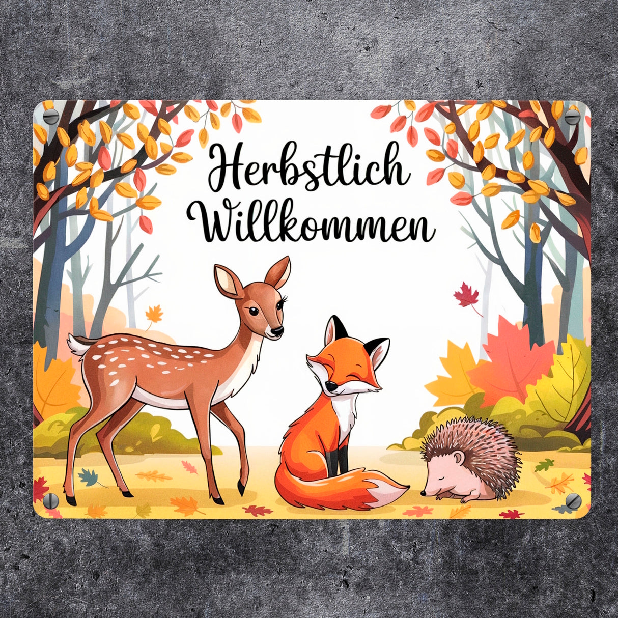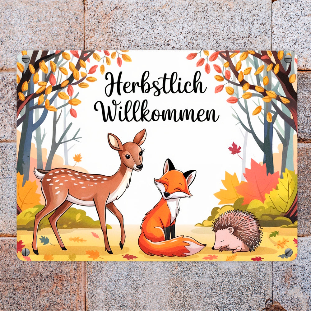 - Willkommen im Herbst! Unser Metallschild begrüßt dich mit einem zauberhaften Aquarell. Hirsch, Fuchs und Igel tummeln sich in einer herbstlichen Waldszene. Perfekt für deinen Eingangsbereich!