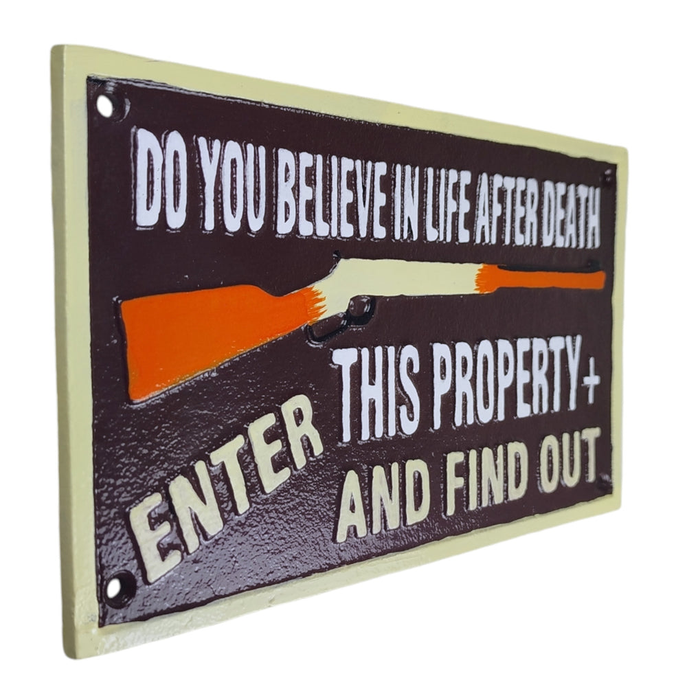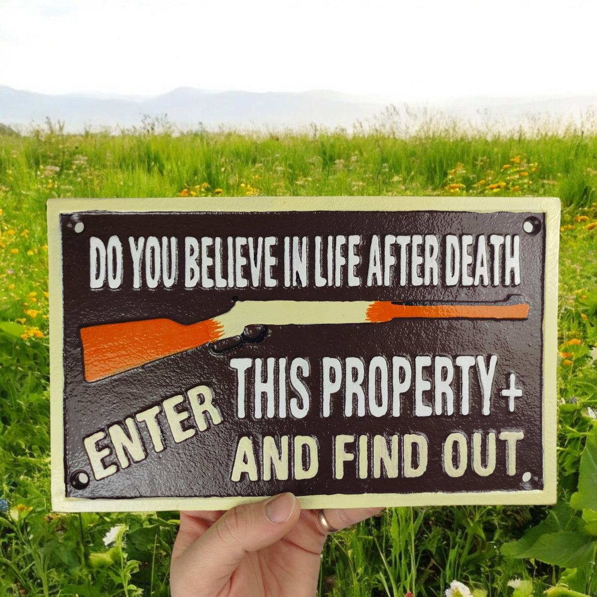 • Das Schild besticht durch sein robustes Design: 5 mm dick und 1,3 kg schwer, mit Löchern an jeder Ecke für einfache Wandmontage. Der beige und weiße Spruch auf dunklem braunen Hintergrund sorgt für einen stilvollen Vintage-Look, während das abgebildete Winchester Gewehr den Warnungseffekt humorvoll unterstreicht.