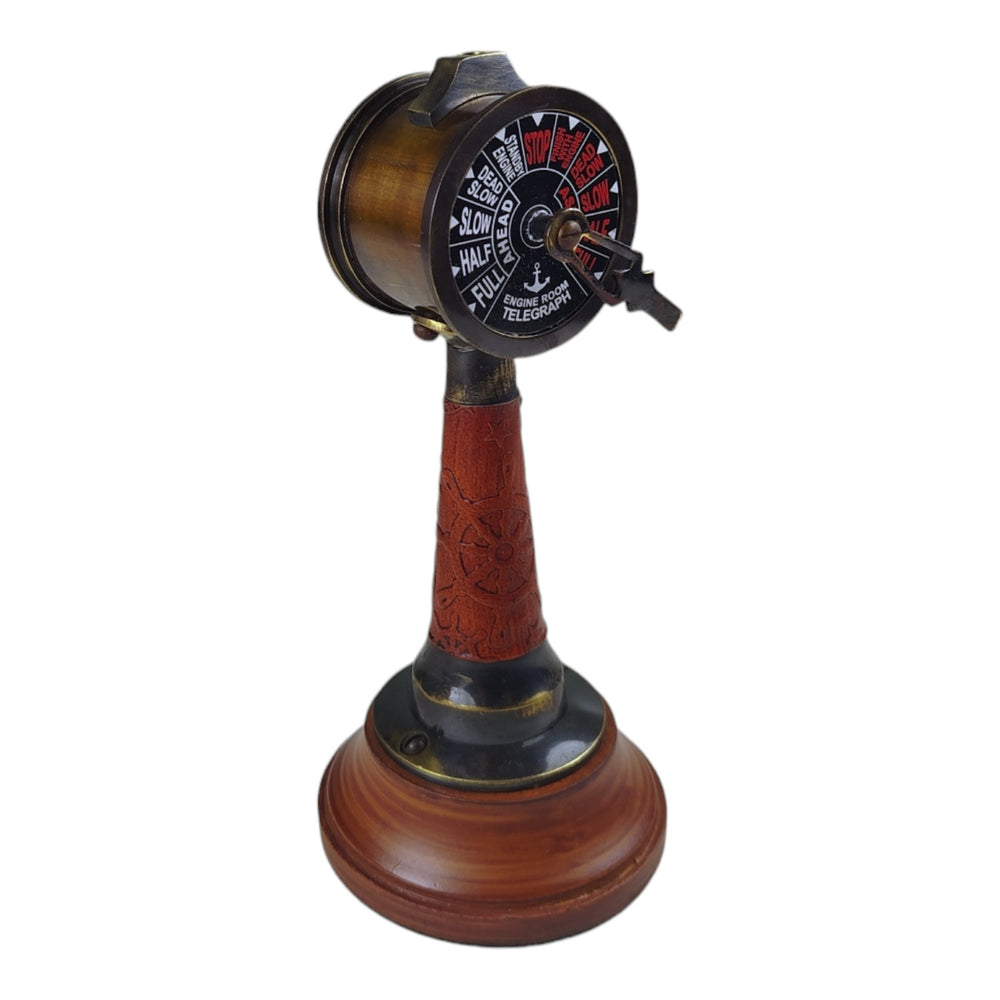 - Der Maschinentelegraf besticht durch sein vintage Design: ein zylinderförmiger Kopf mit einem drehbaren Ziffernblatt, das alle wichtigen Befehle zeigt – „Stop“, „Slow“, „Half“, „Full“. Die aus Metall gefertigten Details auf dem hölzernen Sockel verleihen diesem Stück Stabilität und historischen Charme in jeder Ecke, ohne dabei steif zu wirken.