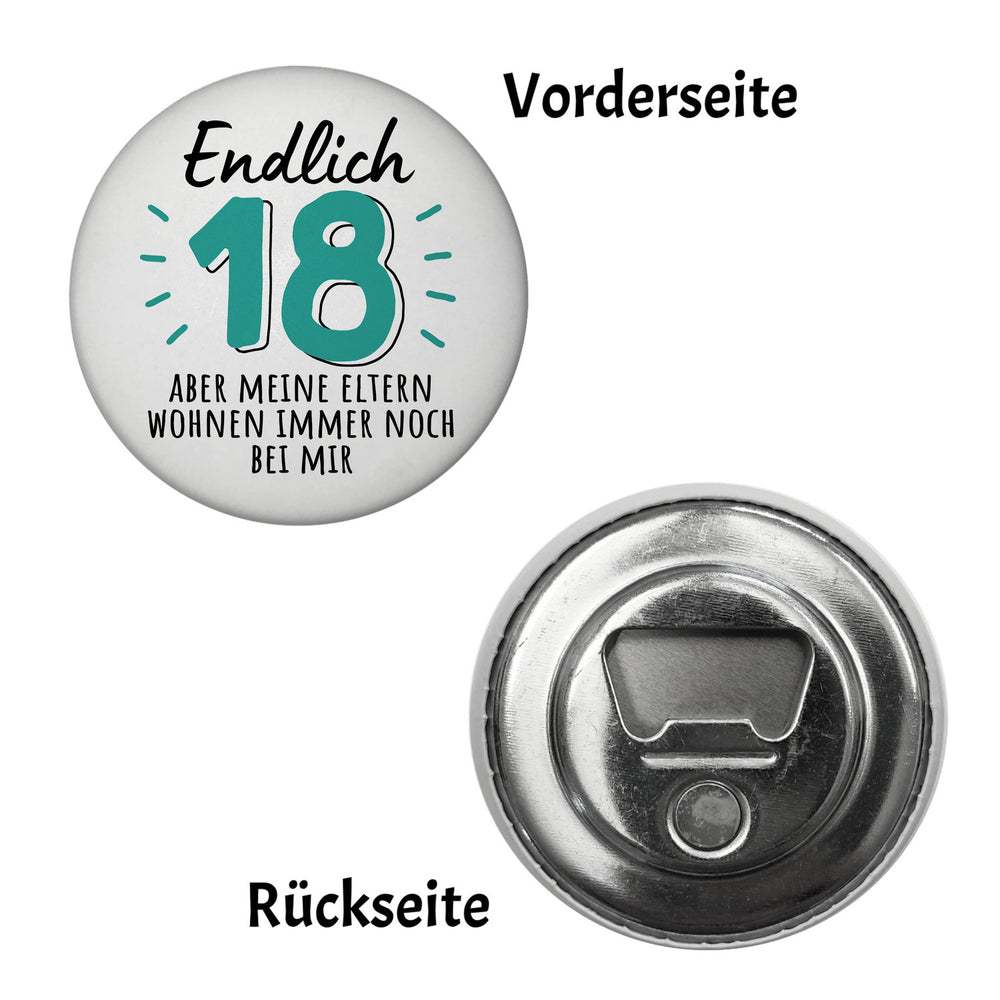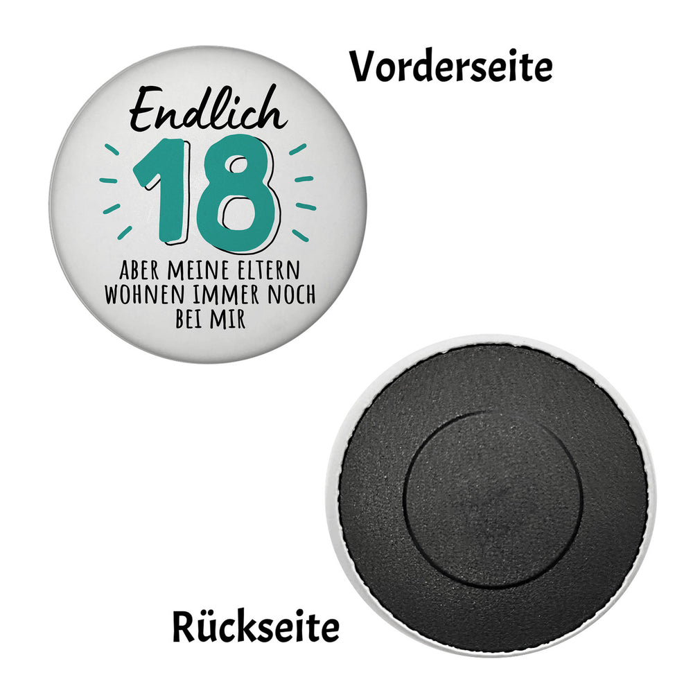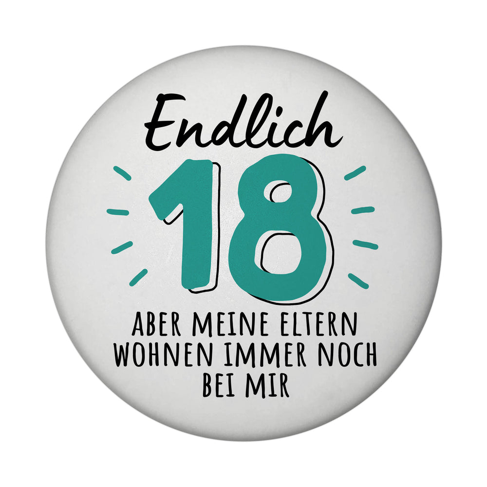 - 1x Endlich 18 Magnet rund mit Spruch aber Eltern wohnen bei mir in der gewählten Ausführung