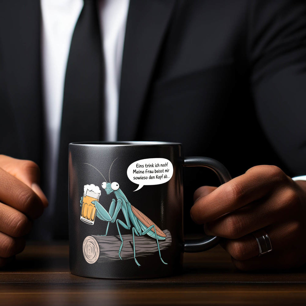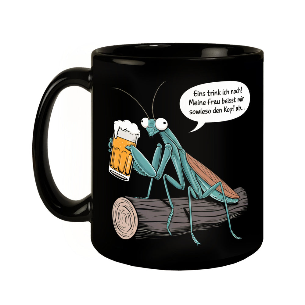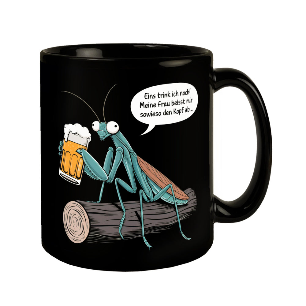 - Unsere Tasse zeigt eine charmante Gottesanbeterin, die lässig mit einem Bierglas auf einem Baumstamm sitzt. Begleitet von einer Sprechblase, die sagt: "Eins trink ich noch! Meine Frau beißt mir sowieso den Kopf ab..." – eine Szene, die jeden Kaffeegenuss mit einer gehörigen Portion Schmunzeln versüßt.