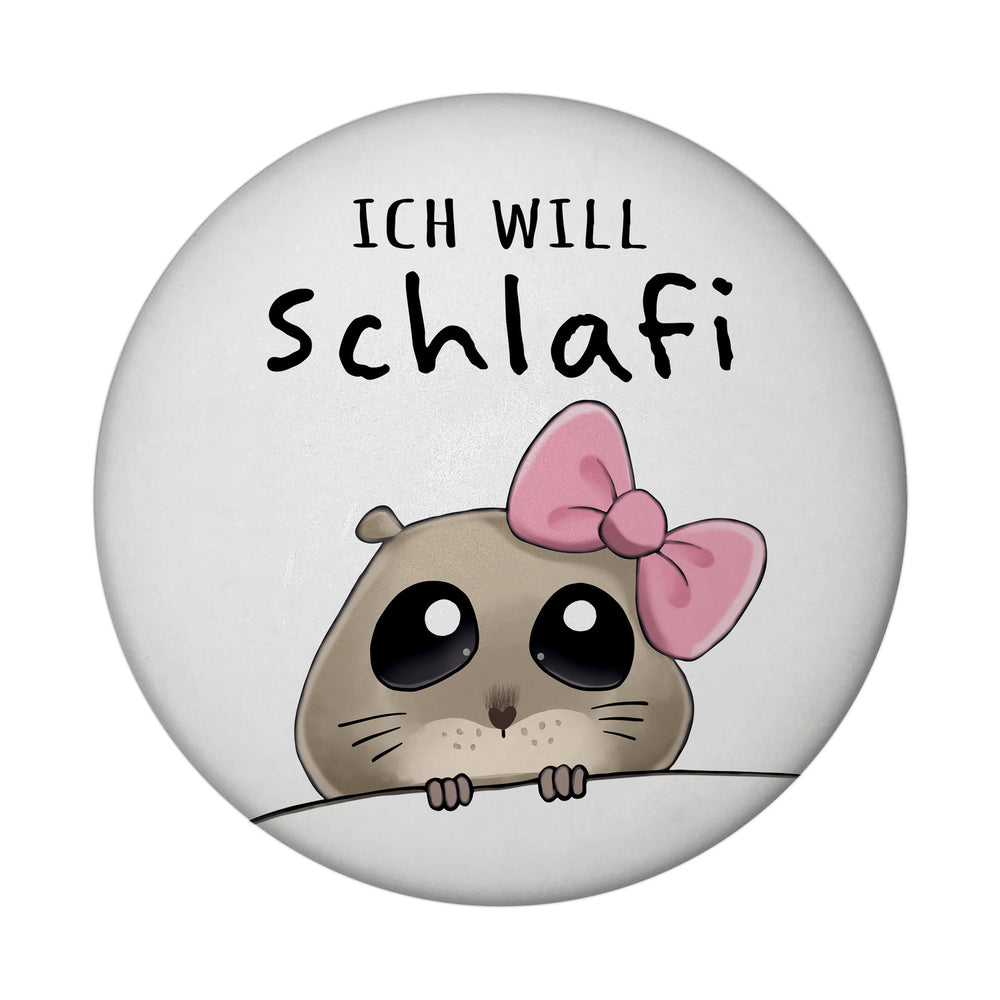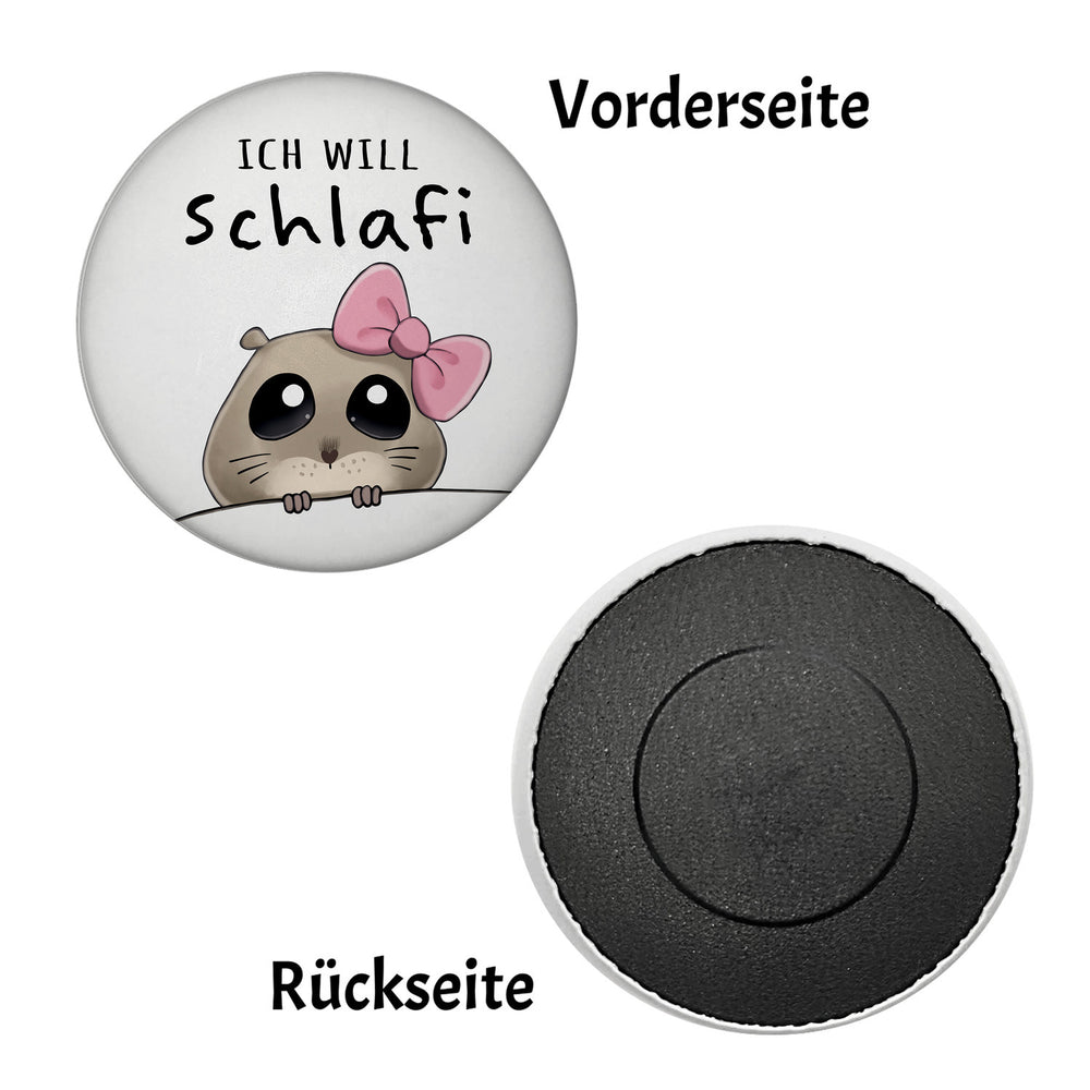 - 1x Meme Hamster Magnet rund mit Spruch Ich will Schlafi in der gewählten Ausführung
