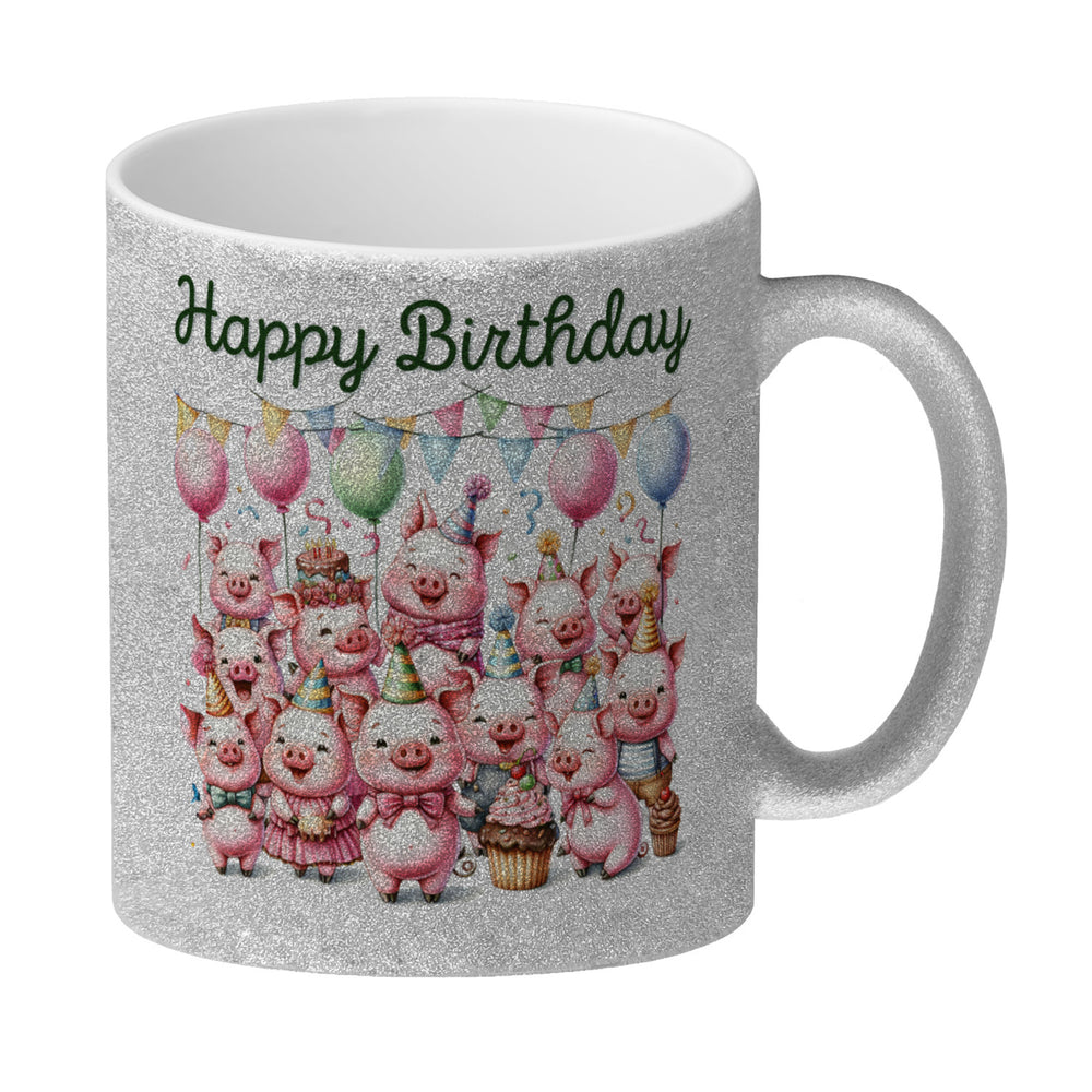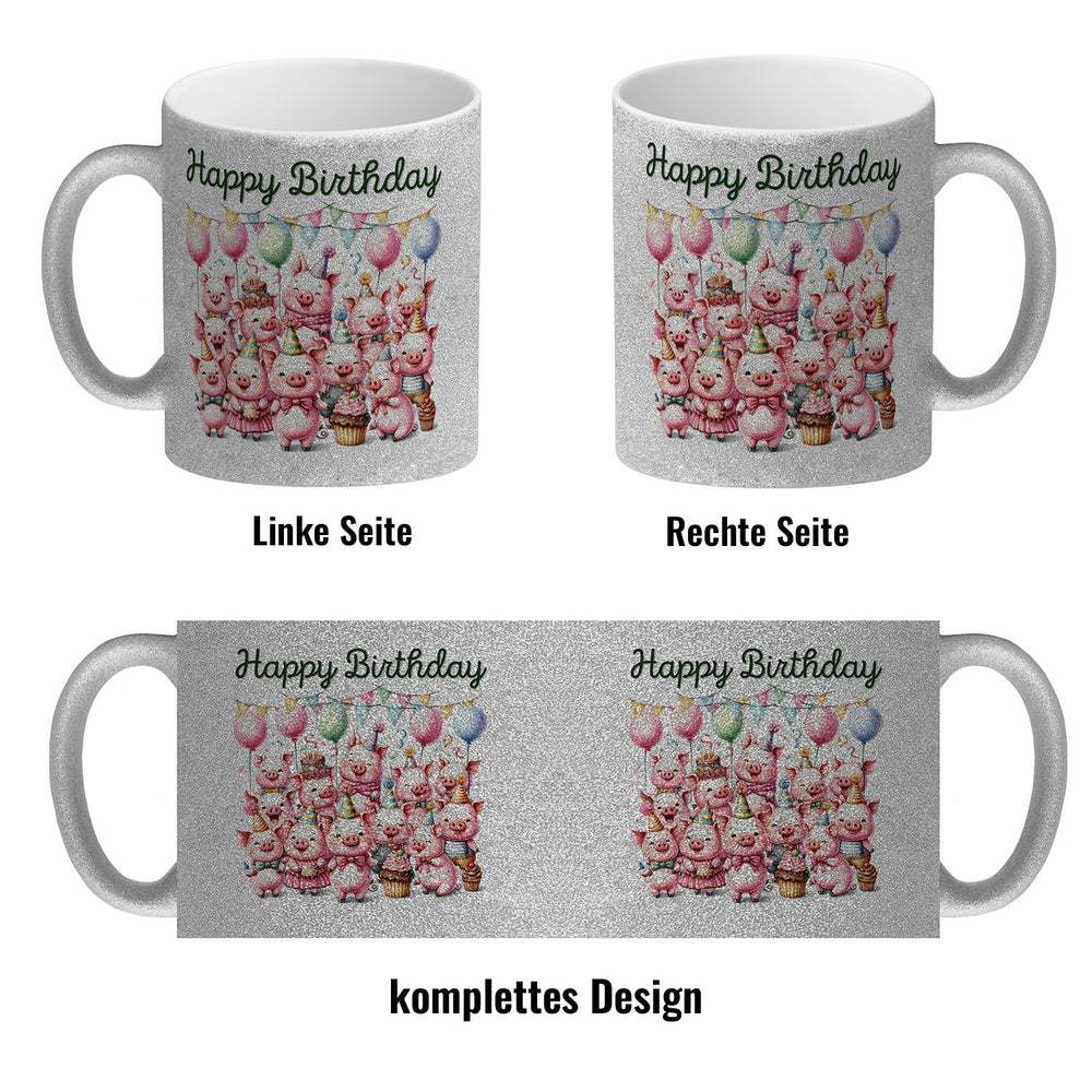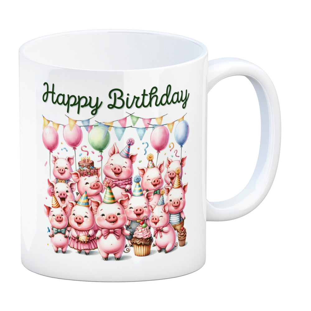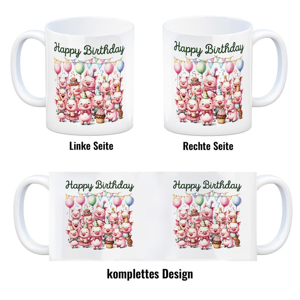 - 1x Schweine Party Kaffeebecher mit Spruch Happy Birthday in der gewählten Ausführung