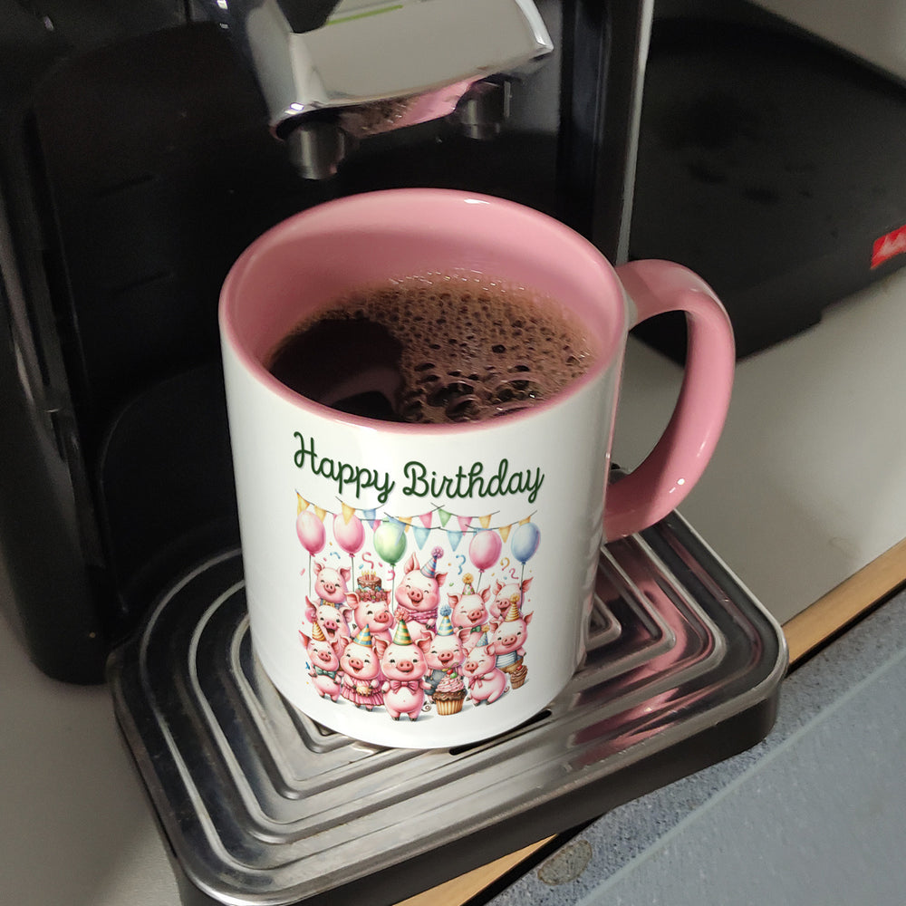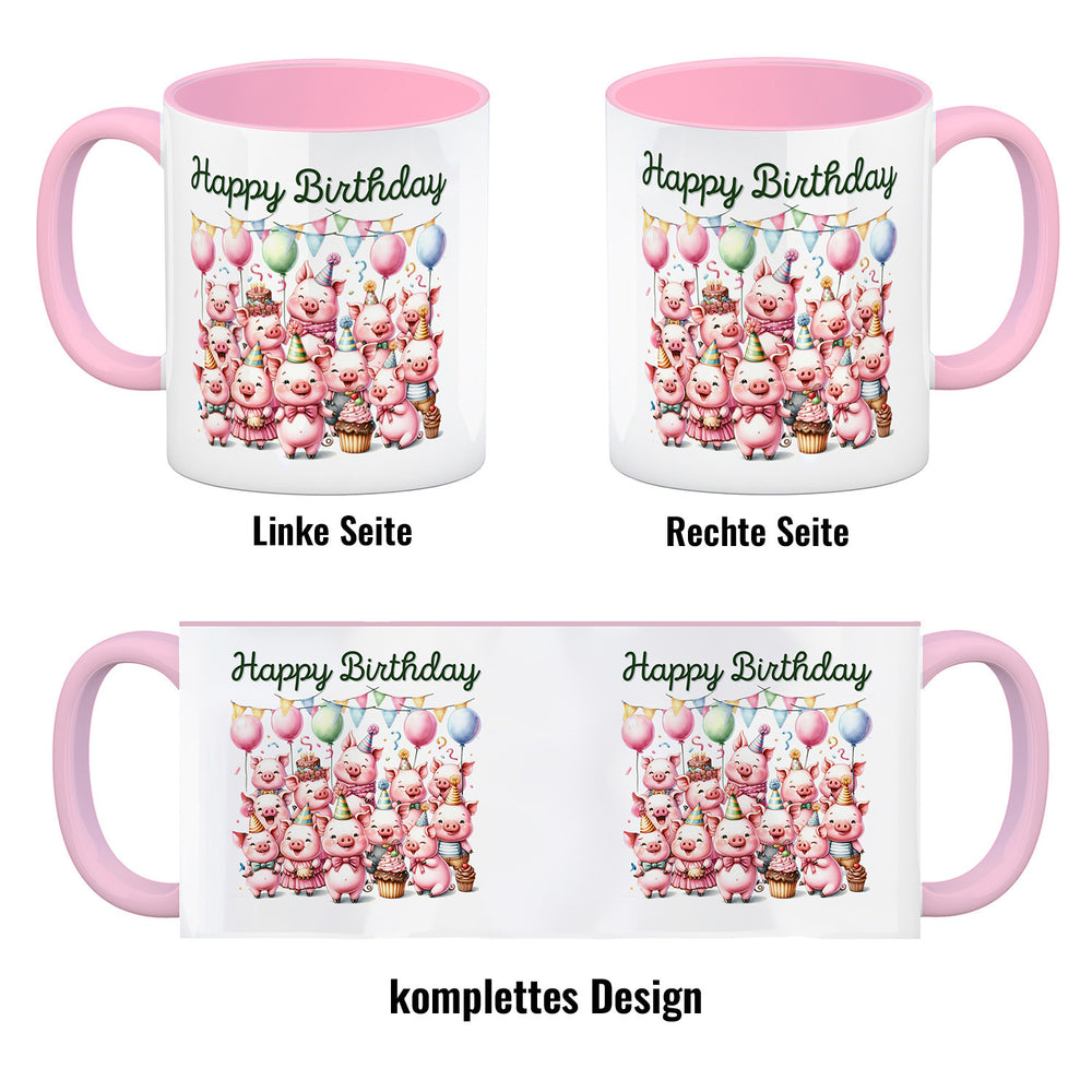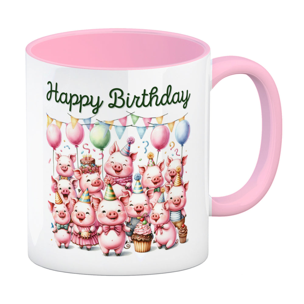 Schweine Party Kaffeebecher mit Spruch Happy Birthday